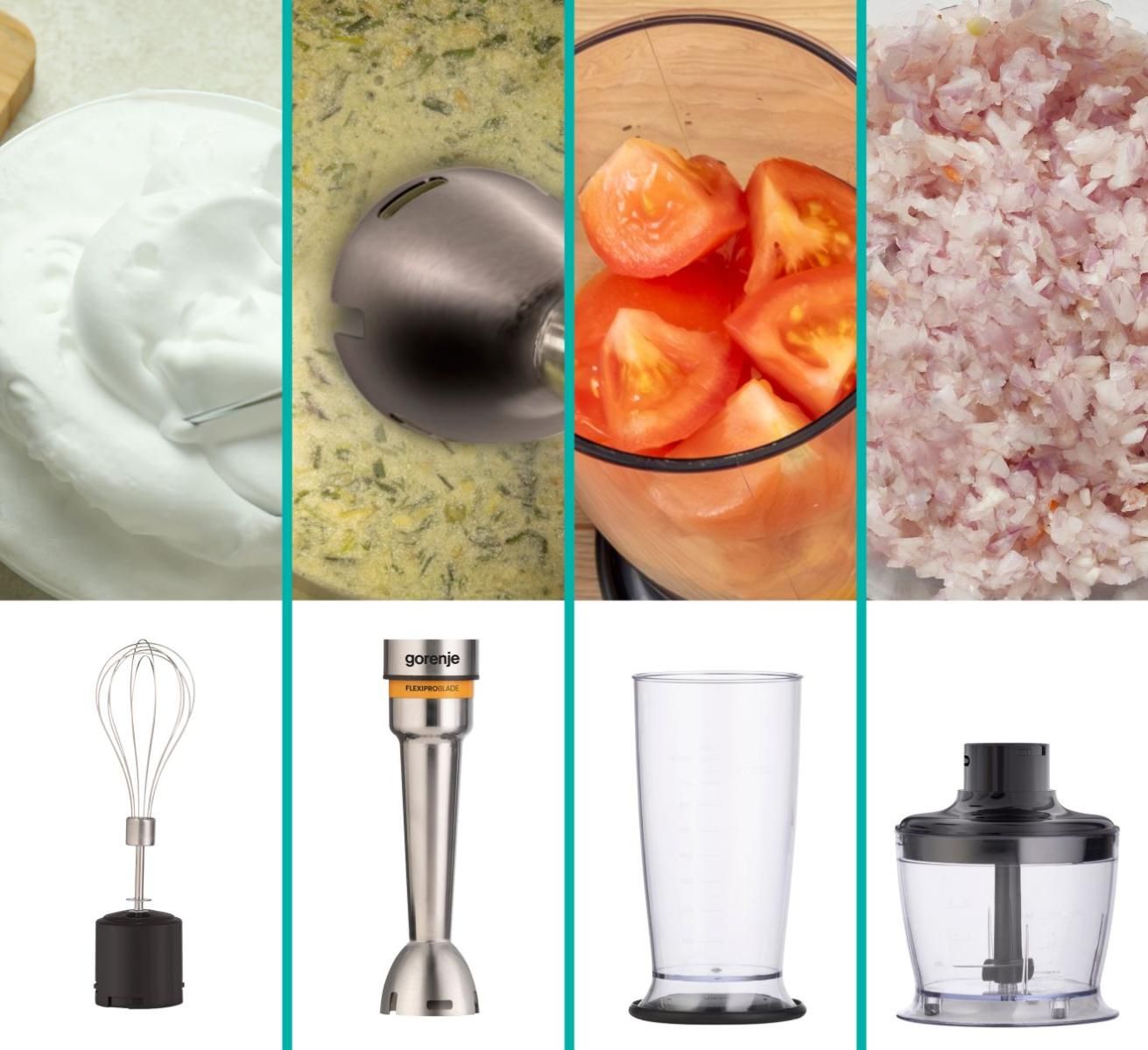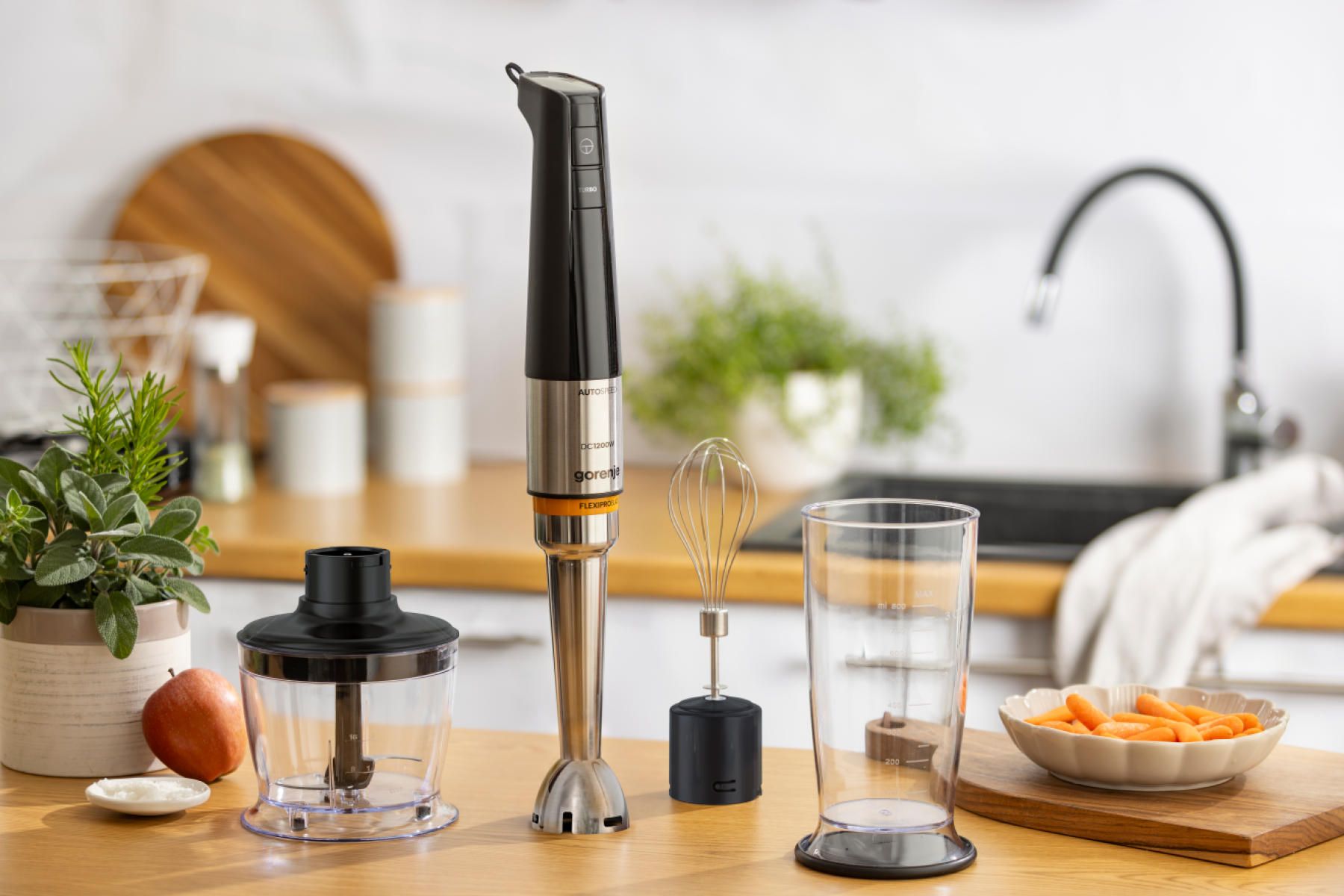Gorenje HBX1200EB – це потужний заглибний блендер 1200 Вт з комплектом 3в1. Модель оснащена DC-двигуном, плавним регулюванням швидкості та імпульсним режимом. У комплекті є металева насадка-блендер, вінчик та подрібнювач з чашею 500 мл.