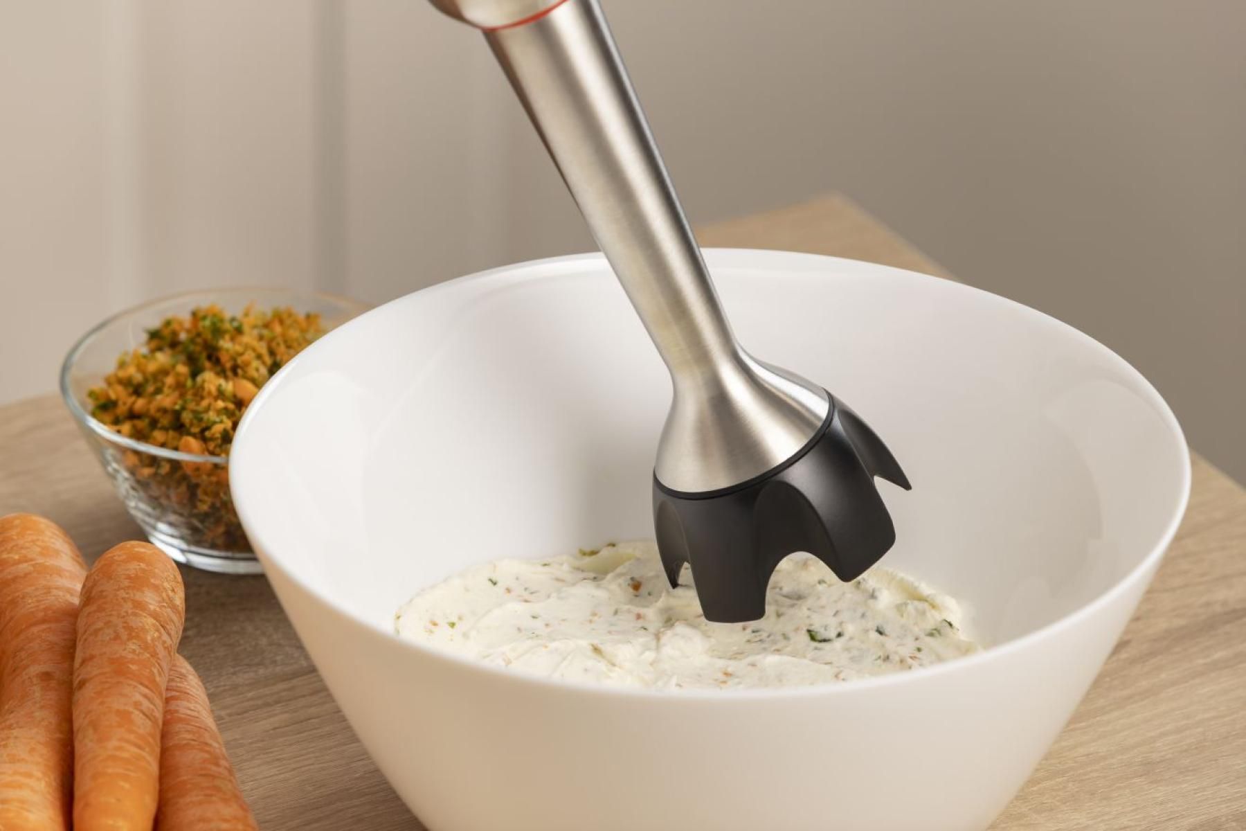 Додатково:мірна шкала на ємності, увімкнення натисканням кнопки, 4-лопасне лезо подрібнювача, насадки приєднуються обертальним способом, DC-двигун постійного струму