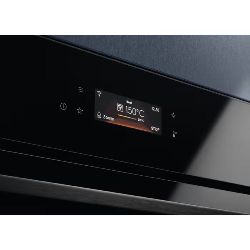 Електрична духова шафа Electrolux серії 700 MealAssist поєднує гаряче повітря та пару з технологією SteamCrisp® для хрусткої скоринки та ніжної серединки. EXCite — сенсорний TFT-дисплей — спрощує керування, термощуп контролює готовність усередині страви, а AquaClean допомагає швидко очистити камеру парою. Підтримується керування через застосунок Electrolux.