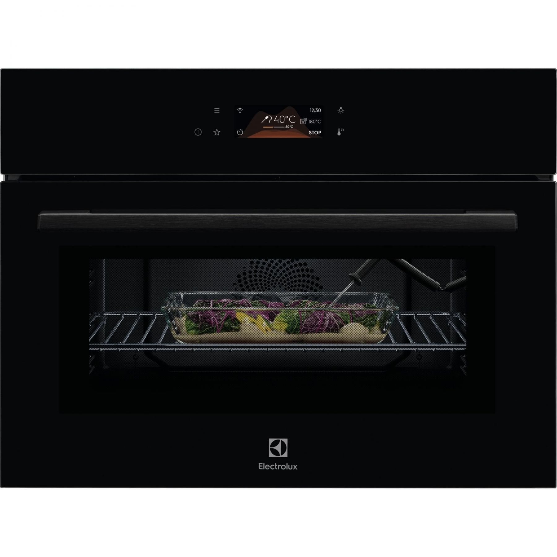 Компактна вбудована електрична духова шафа Electrolux 800 MealAssist CombiQuick® поєднує конвекційний нагрів і мікрохвильову обробку для скорочення часу приготування приблизно вдвічі. Керування здійснюється через сенсорний TFT-дисплей EXCite з миттєвим зворотним зв’язком. Функція Assisted Cooking автоматично пропонує оптимальні параметри для різних страв. Для точного контролю готовності передбачено термощуп, а конвекційна система забезпечує рівномірне приготування.