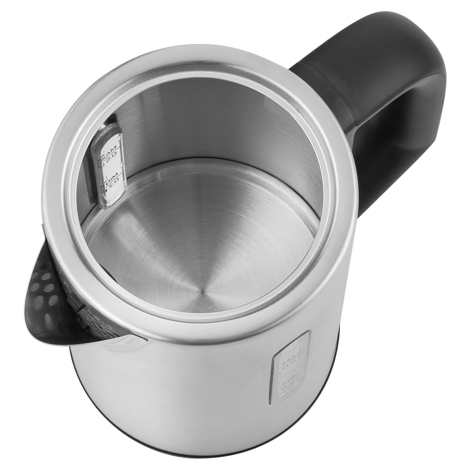 Sencor SWK170SS — ультракомпактний дорожній електрочайник 0,5 л з нержавіючої сталі та потужністю 1100 Вт. У комплекті 2 пластикові склянки + 2 ложки без BPA. Прихований нагрівач, подвійний захист (від сухого включення та перегріву), знімний фільтр від накипу, віконце рівня води та відсік для кабелю. Ідеальний для подорожей, кемпінгу, офісу чи маленької кухні.
