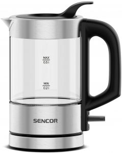 Електрочайник Sencor 0.5л, Strix, пластик, в комплекті 2 склянки + 2 ложки, скло, нерж. сталь