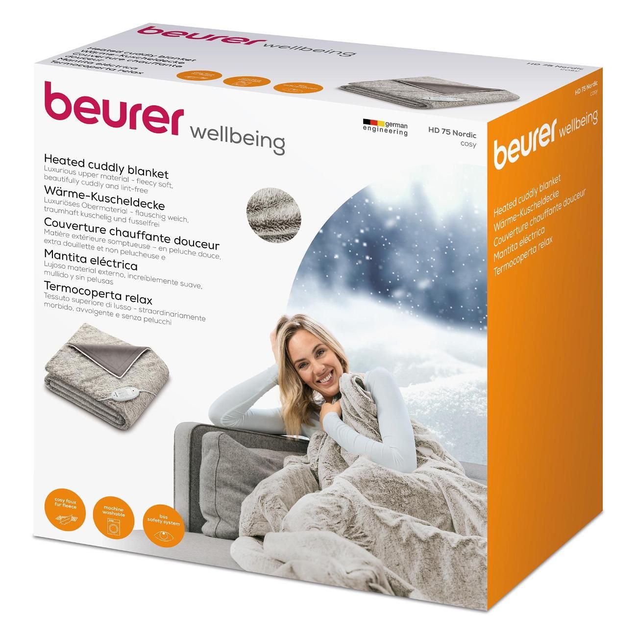 Електроковдра Beurer HD 75 Nordic призначена для підтримання стабільного тепла під час відпочинку в холодний період. Великий формат 180 × 130 см дозволяє повністю загорнутися на дивані або в ліжку. Пухнастий фліс забезпечує м’яку контактну поверхню та рівномірний розподіл тепла. Шість температурних рівнів дають змогу точно регулювати інтенсивність обігріву. Знімний перемикач спрощує догляд і дозволяє прати текстильну частину в машинці.