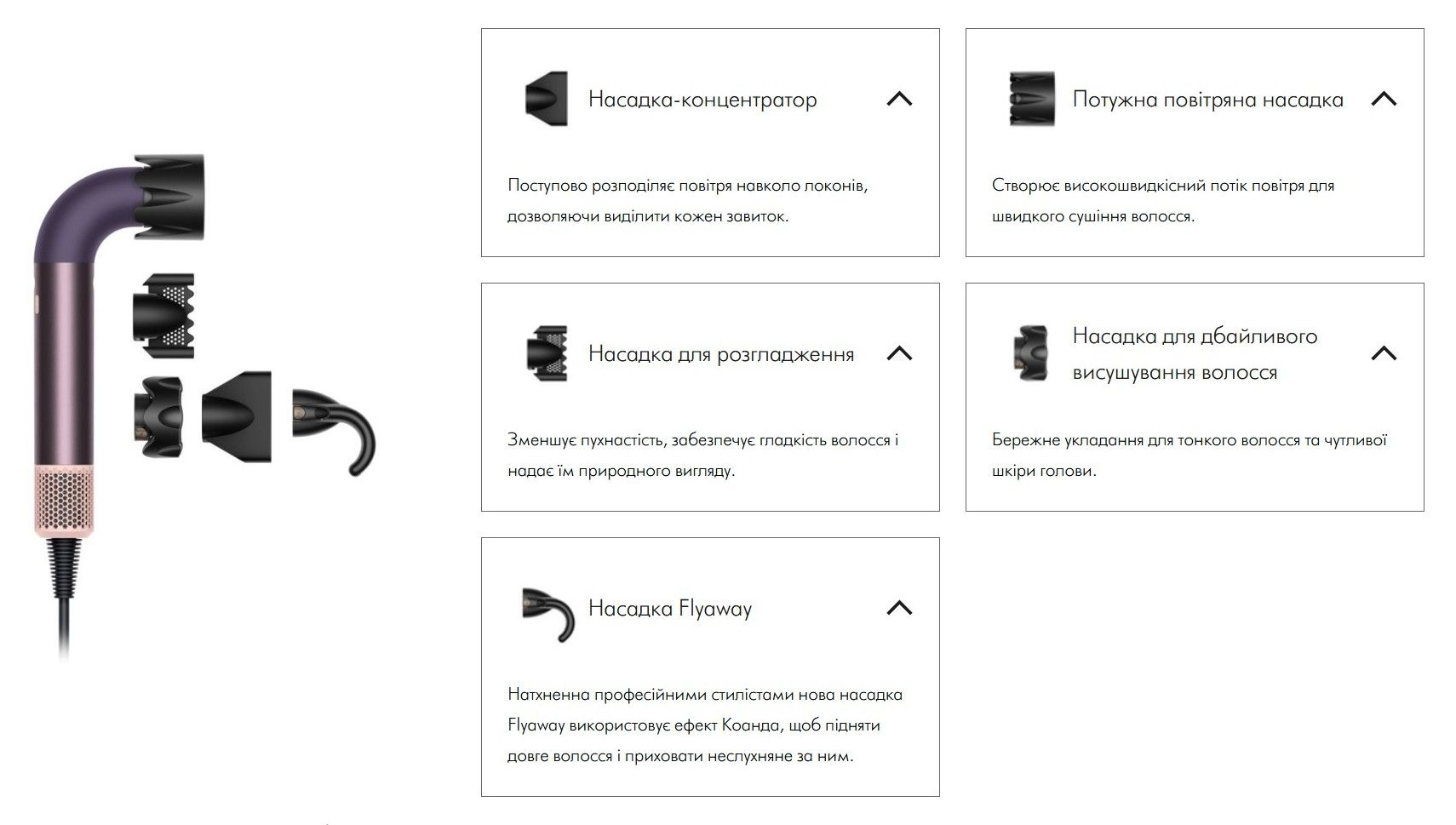 Насадки в комплекті:концентратор, насадка для розгладження, насадка для делікатного сушіння волосся, Flyaway, потужна повітряна насадка