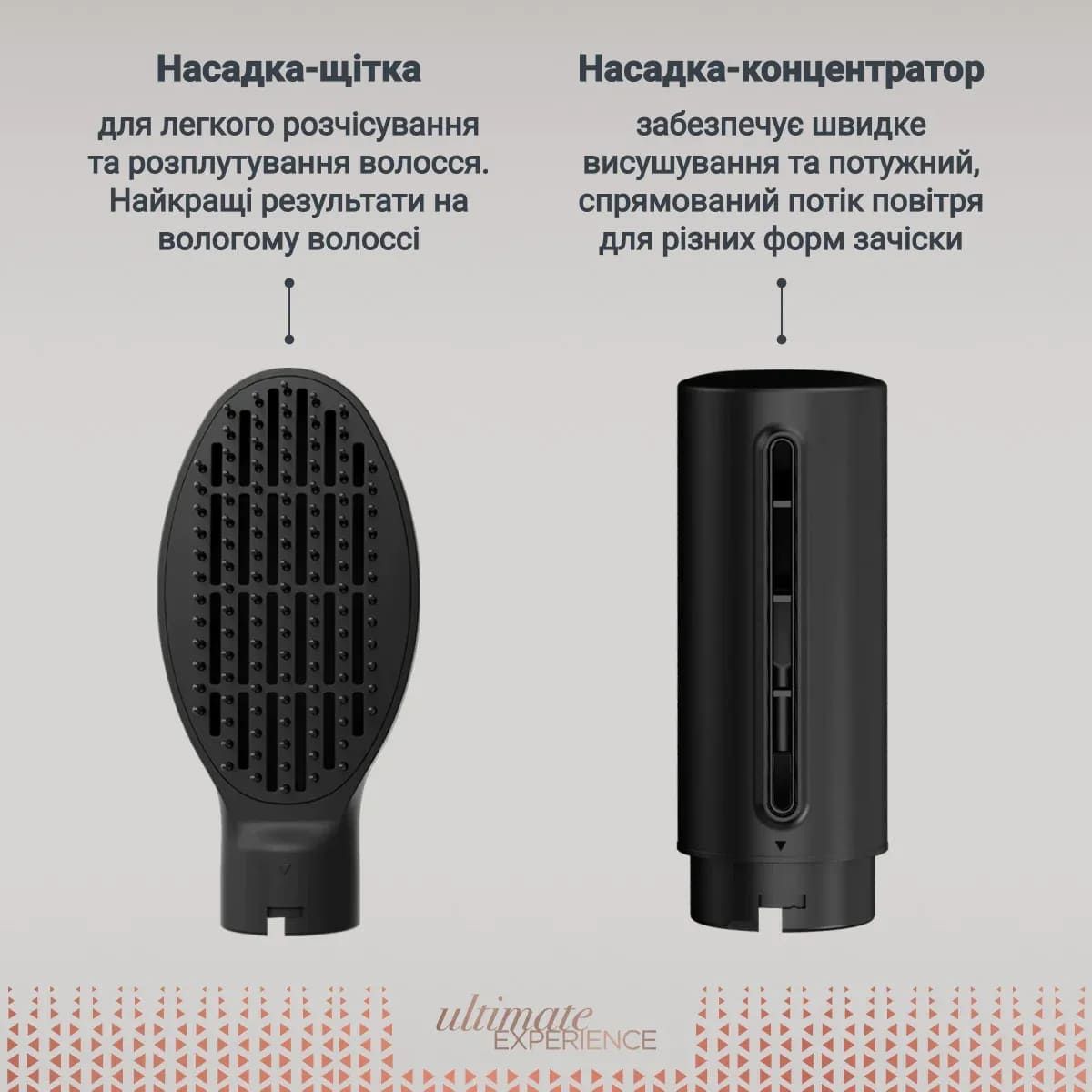 Насадки в комплекті:концентратор, конусна, щітка для випрямлення волосся, кругла щітка