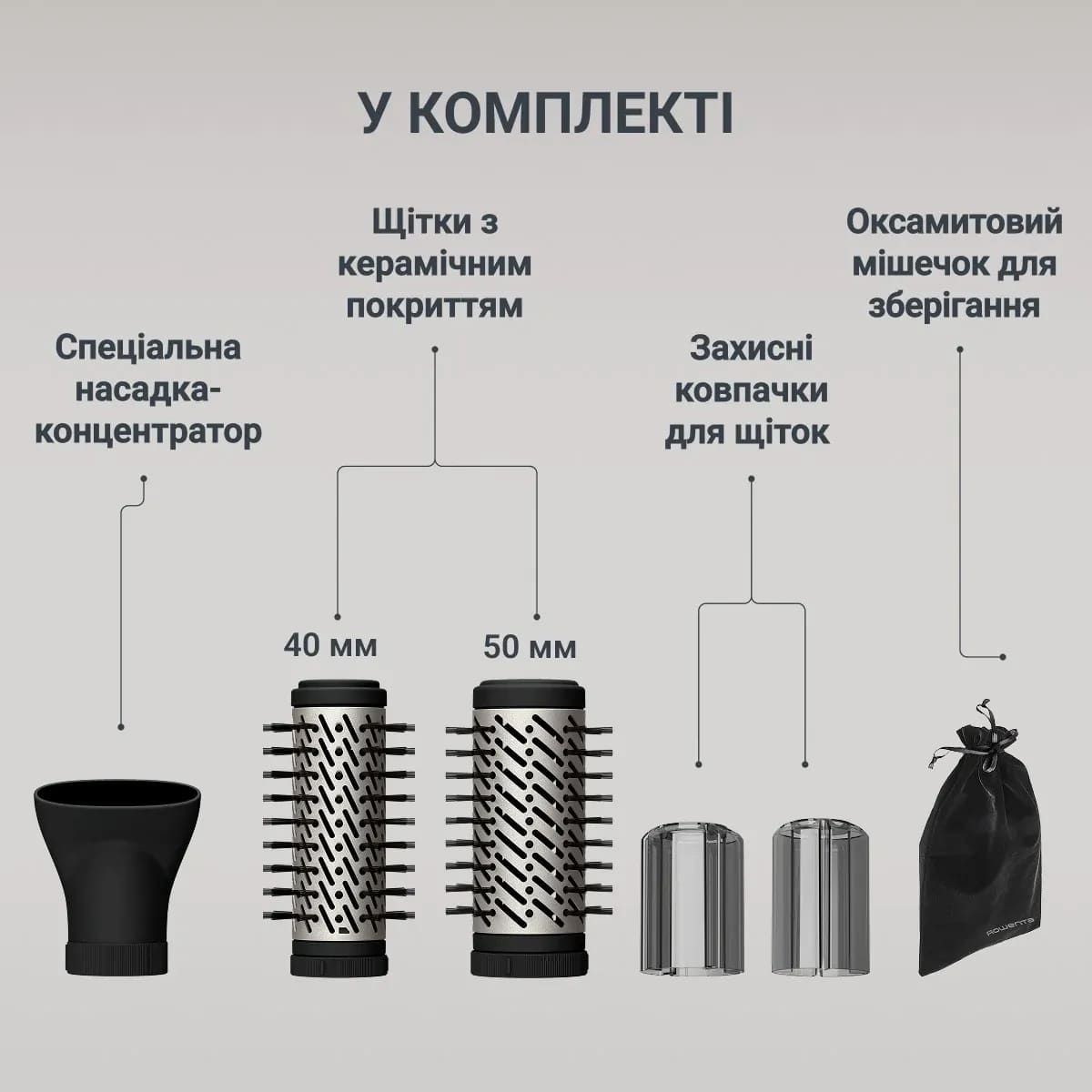 Комплектація:Насадки, інструкція, Гарантійний талон, Фен-щітка, Оксамитовий мішечок