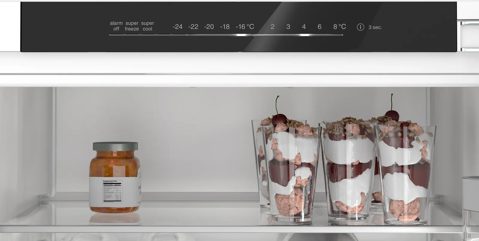 Вбудований холодильник Bosch формату XL із нижньою морозильною камерою. Система VitaFresh XXL забезпечує оптимальні умови для довготривалого збереження свіжості: окрема зона з температурою близько 0 °C підтримує належні умови для м’яса та риби, а регульований мікроклімат у великому відділенні допомагає довше зберігати свіжість фруктів і овочів. Передбачено NoFrost у морозильній камері, EcoAirflow для стабільної температури й вологості, функції SuperCooling і SuperFreezing для швидкого охолодження та заморожування, LED-освітлення, а також попереджувальний сигнал відкритих дверцят.