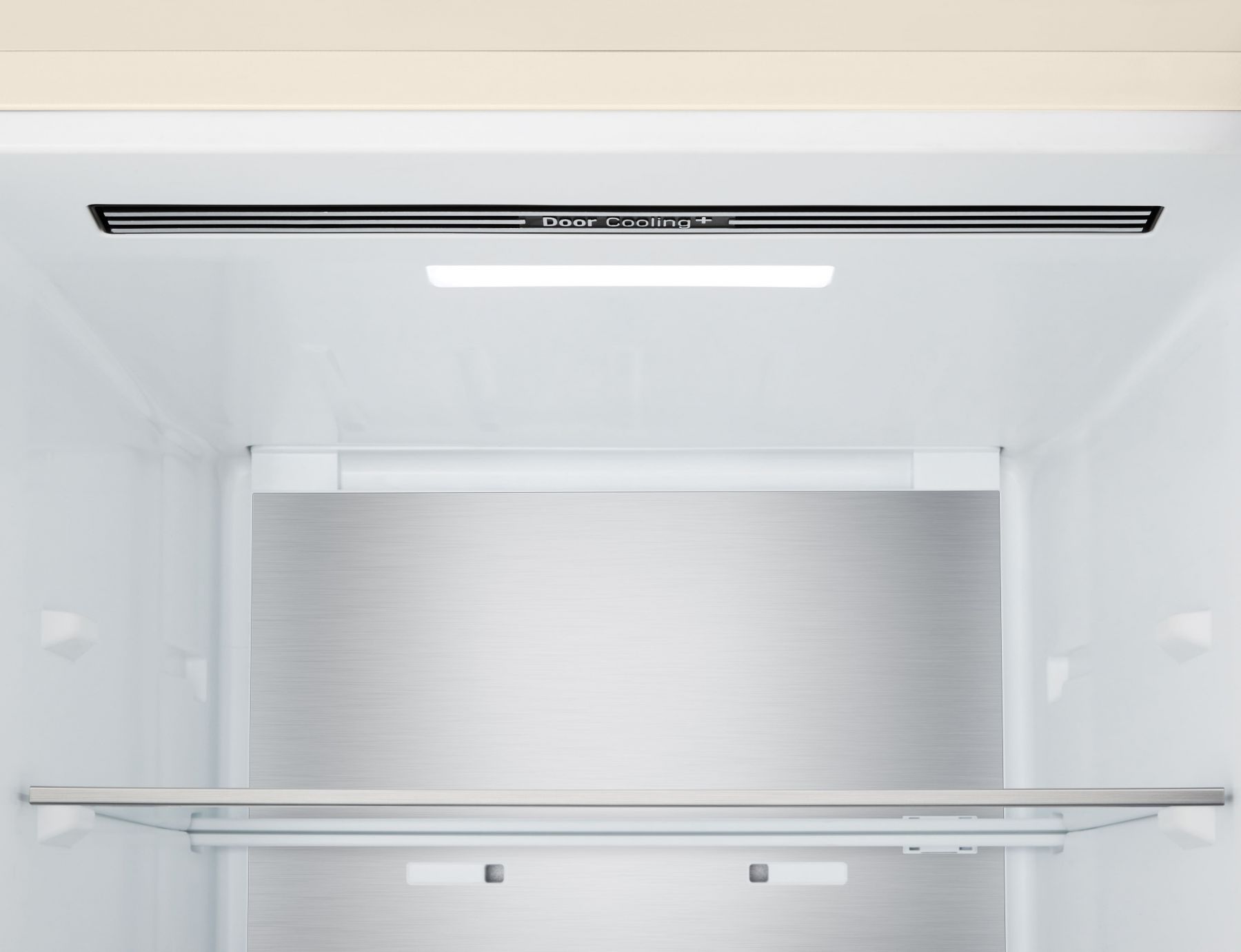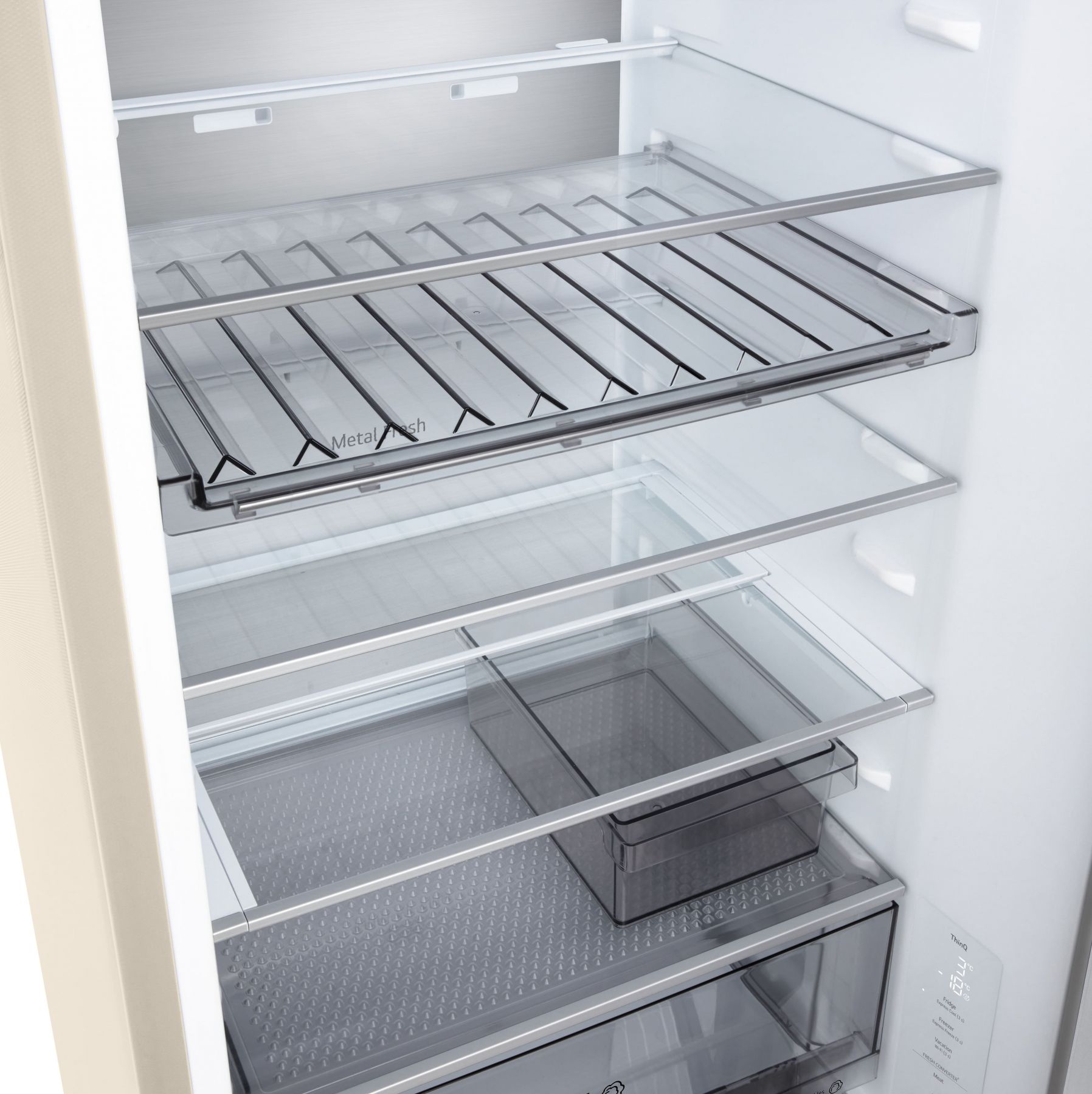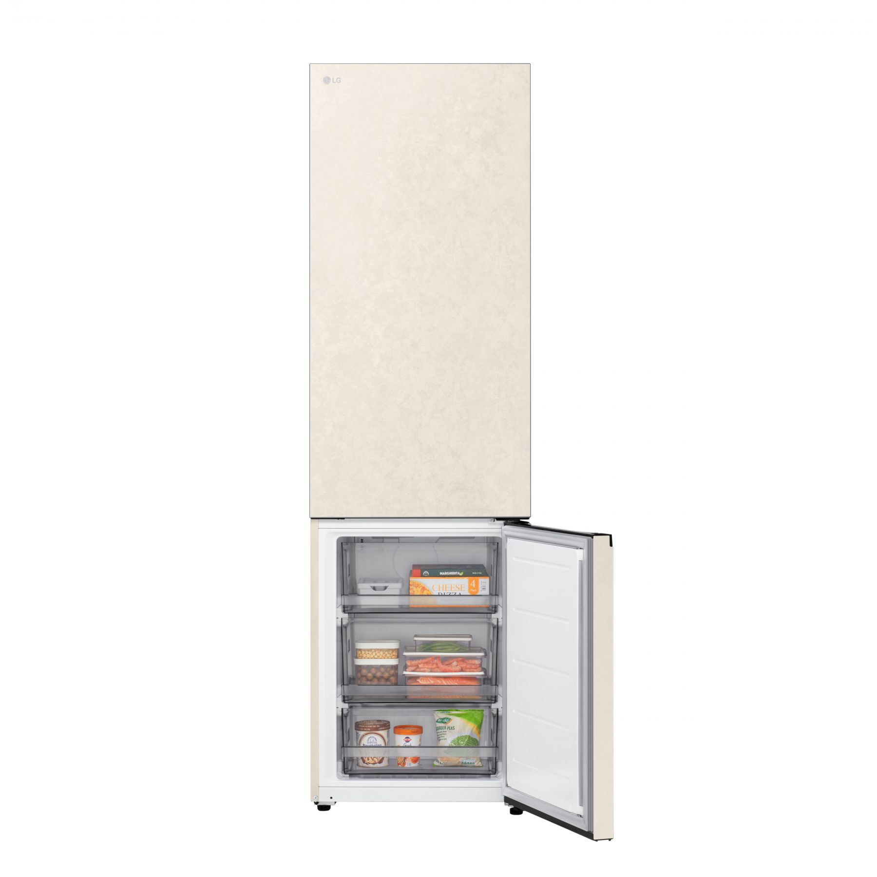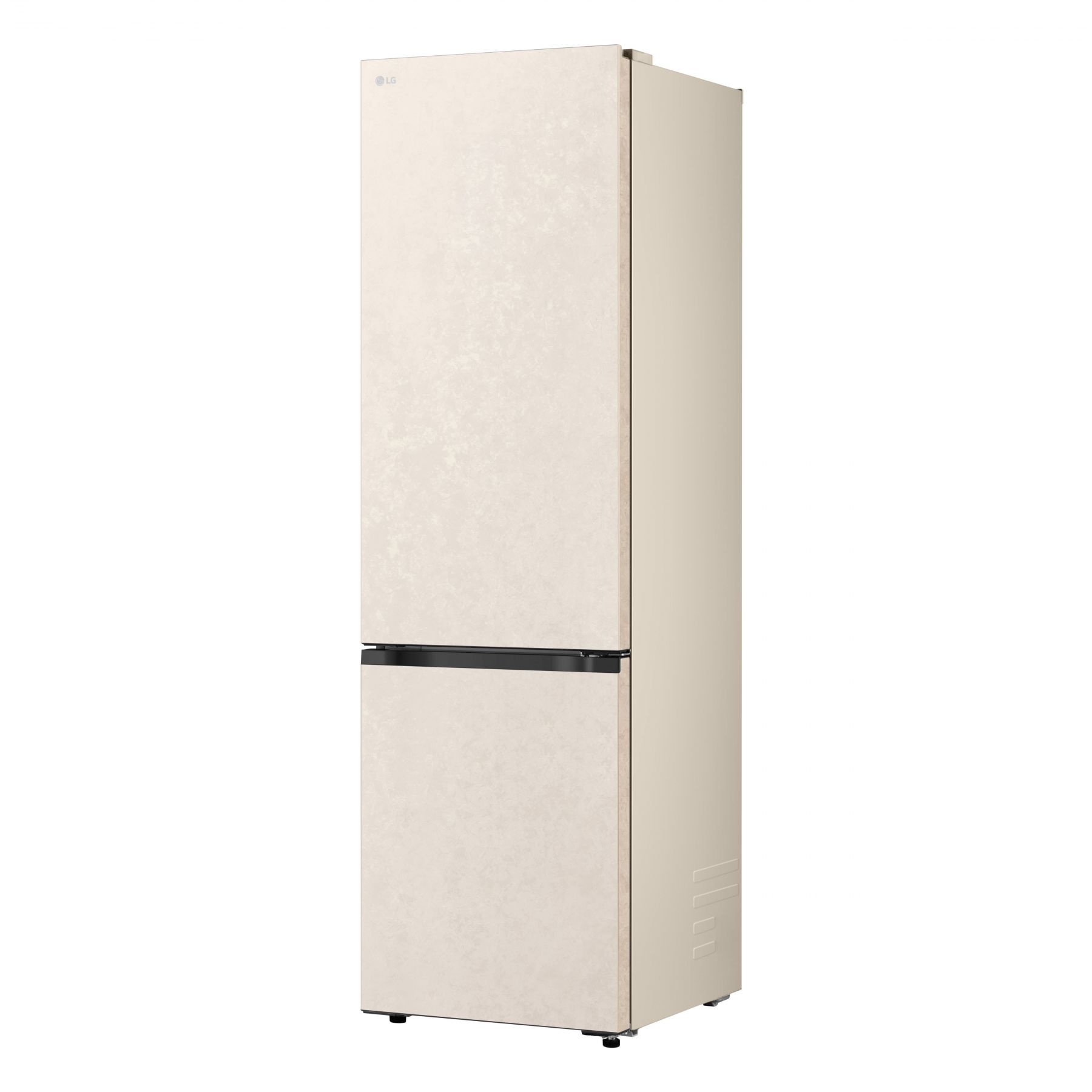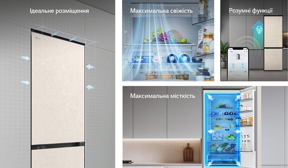 Холодильник LG GC-B509EESM з нижньою морозильною камерою має корисний об’єм 375 л (262 л холодильне + 113 л морозильне відділення) і належить до енергетичного класу E. Інверторний компресор забезпечує тиху роботу на рівні 35 дБ та потужність заморожування до 10 кг на добу. Система Total No Frost усуває потребу в розморожуванні, а Metal Fresh разом із зонами Fresh Converter та Fresh Balancer дозволяють підтримувати оптимальні умови для різних типів продуктів. Бежевий матовий колір корпусу та прихована горизонтальна ручка створюють м’який, нейтральний вигляд.