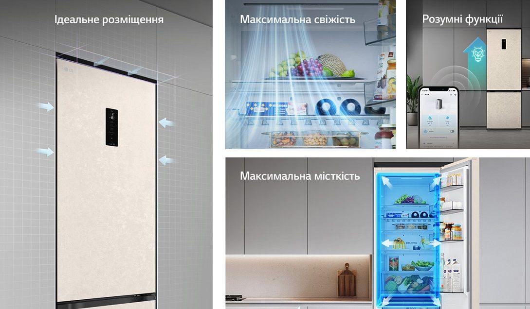 Функції / можливості:Експрес заморозка, Зона свіжості FRESH Balancer, Зона свіжості FRESH Converter, Експрес охолодження, Багатопотокова система охолодження Multi Air Flow, DoorCooling+, Сигнал відкритих дверцят, кришка Moist Balance Crisper, Технологія контролю напруги, LG ThinQ з керуванням через Wi-Fi, Інтелектуальна система діагностики Smart Diagnosis