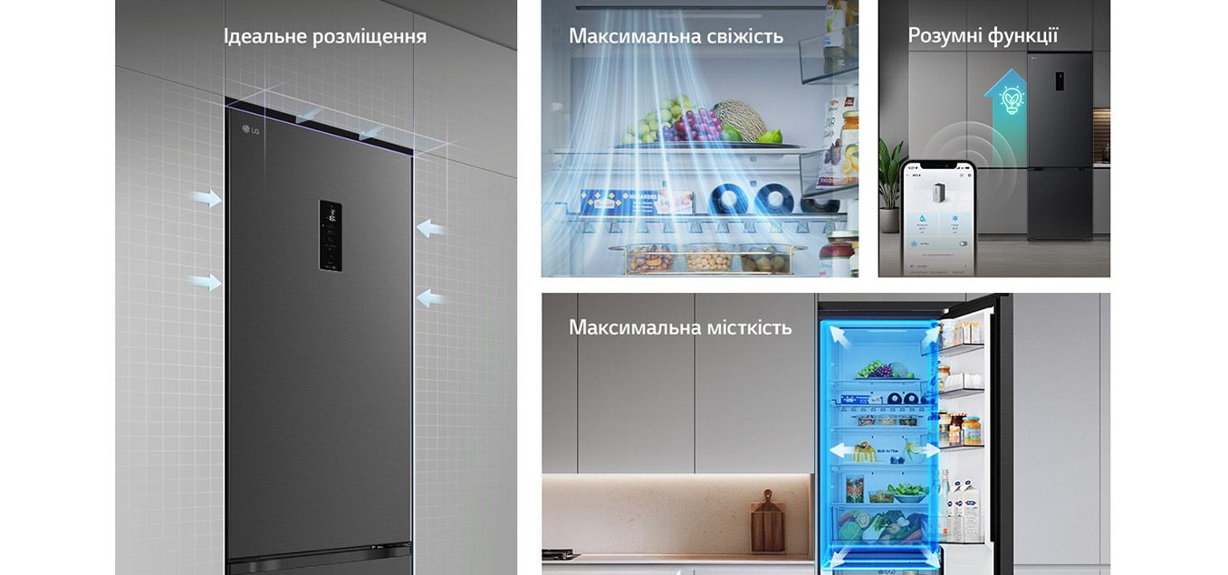 Функції / можливості:Експрес заморозка, Зона свіжості FRESH Balancer, Зона свіжості FRESH Converter, Експрес охолодження, Багатопотокова система охолодження Multi Air Flow, DoorCooling+, Сигнал відкритих дверцят, кришка Moist Balance Crisper, Технологія контролю напруги, LG ThinQ з керуванням через Wi-Fi, Інтелектуальна система діагностики Smart Diagnosis