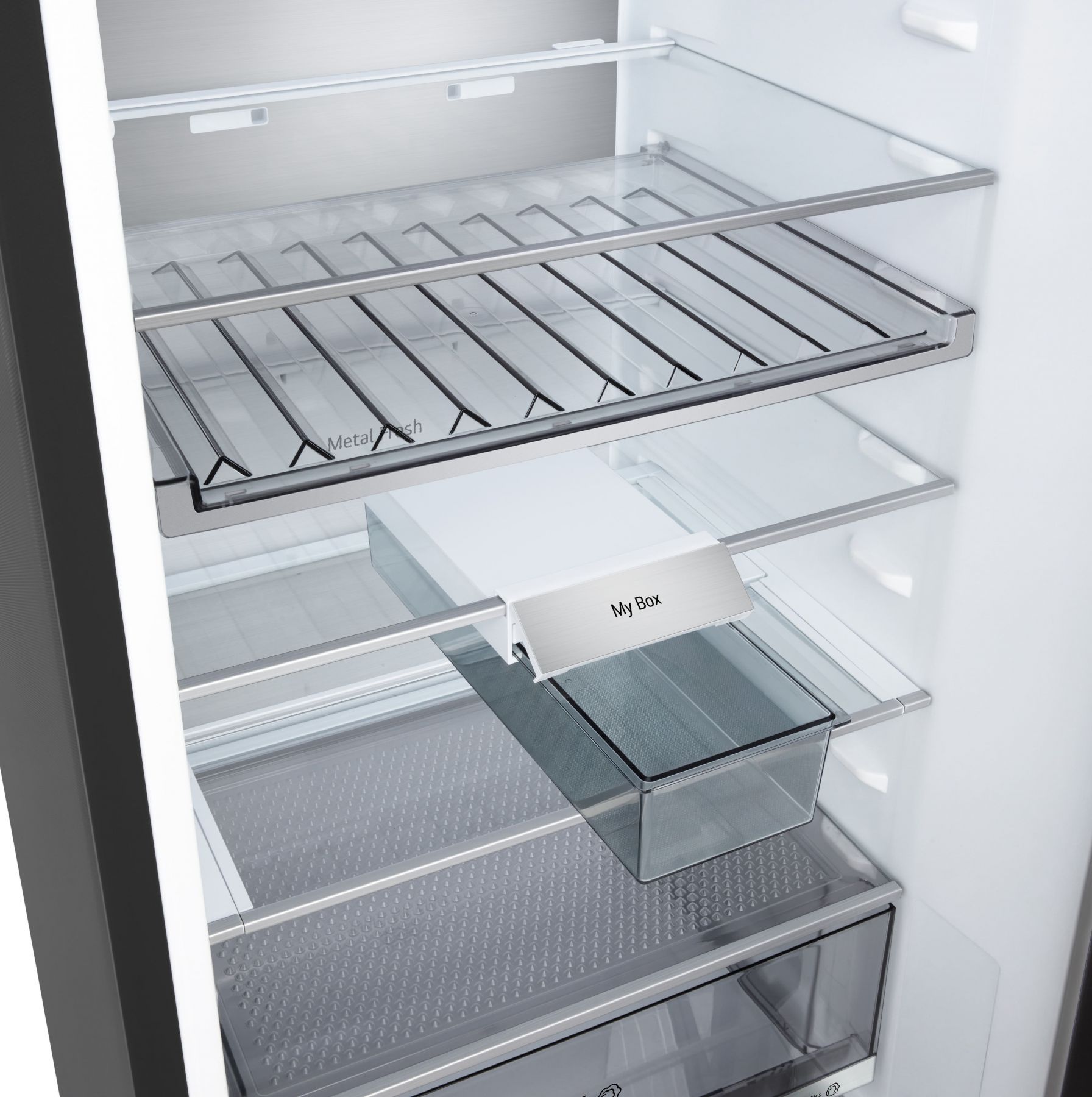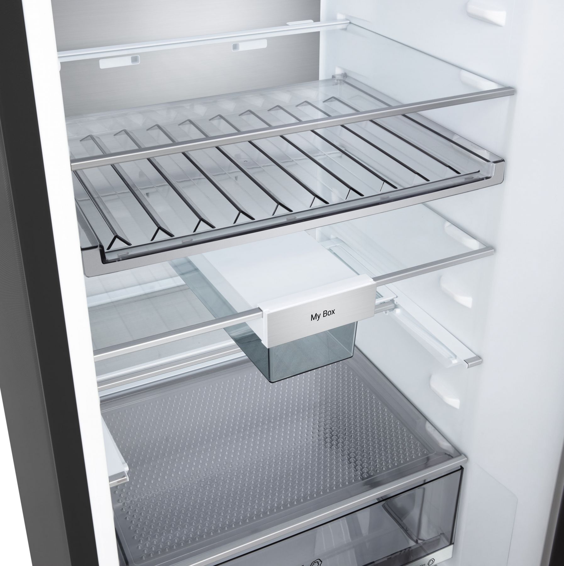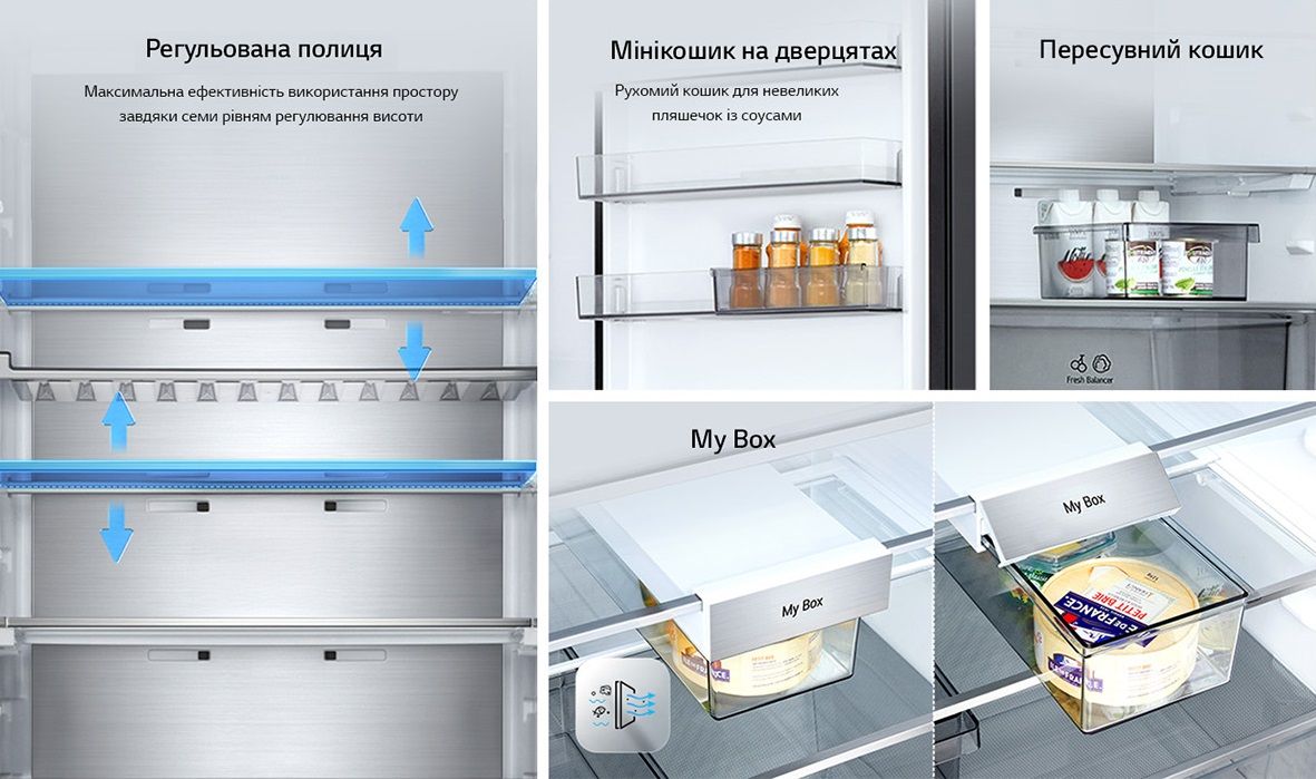 Додатково:Перевішування дверей, металеве декорування полиць та ящиків, нульовий зазор, лоток для заморожування льоду, винна полиця, складана полиця, пересувний кошик, міні кошик на дверцятах, висувний контейнер для дрібної їжі My Box, прозорі дверні кошики, висувні контейнери