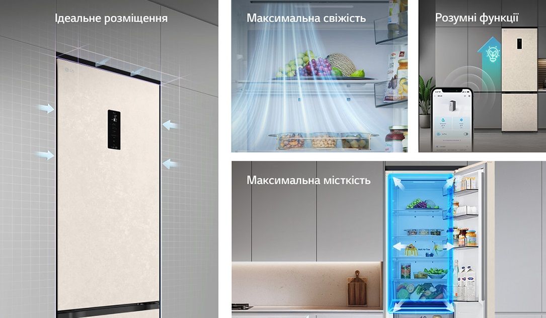 Функції / можливості:Експрес заморозка, Експрес охолодження, Багатопотокова система охолодження Multi Air Flow, DoorCooling+, Fresh Zone, Сигнал відкритих дверцят, Технологія контролю напруги, LG ThinQ з керуванням через Wi-Fi, Інтелектуальна система діагностики Smart Diagnosis