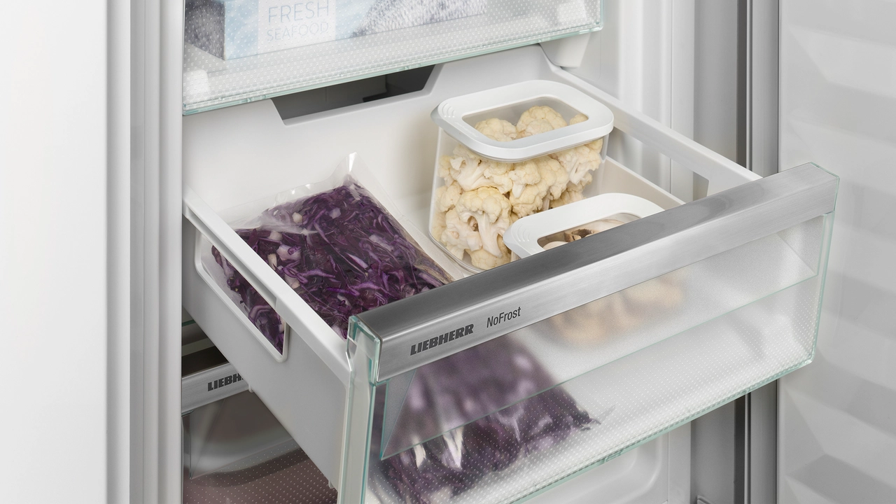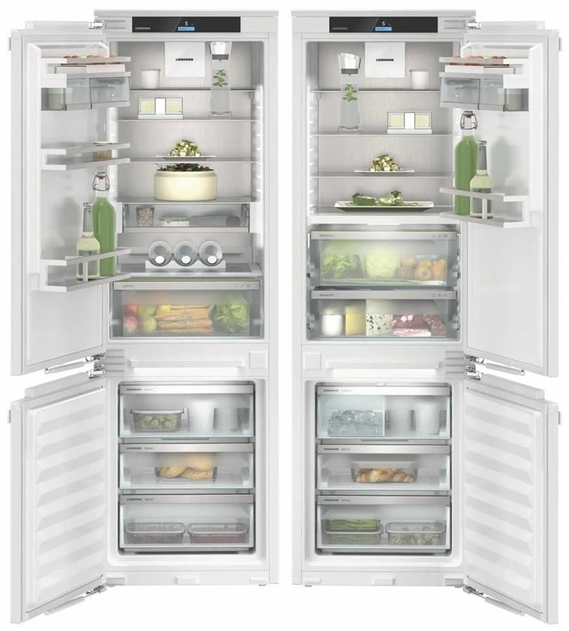 Liebherr IXCC 5165 22 Prime — вбудований чотиридверний холодильник Side-by-side з корисним об'ємом 482 л і п'ятьма незалежними температурними зонами для максимально точного зберігання продуктів. BioFresh із двома контейнерами та окремим відсіком 69 л підтримує температуру ~0 °C і регульовану вологість — м'ясо, риба та овочі зберігаються в кілька разів довше. NoFrost і DuoCooling забезпечують роздільну циркуляцію повітря без інею та змішування запахів, а вбудований IceMaker виробляє до 1,2 кг льоду на добу. Рівень шуму лише 36 дБ і інверторний компресор гарантують тихий і економний клас C.