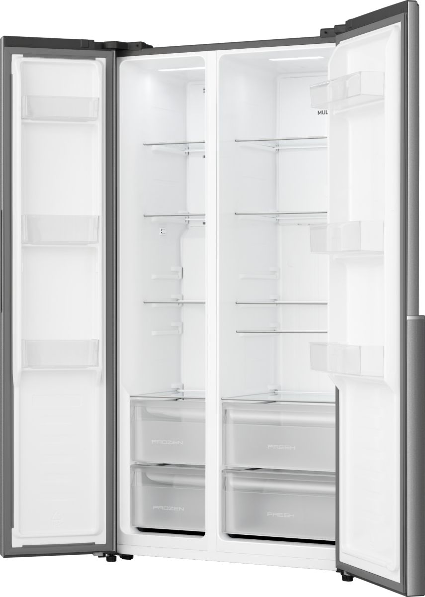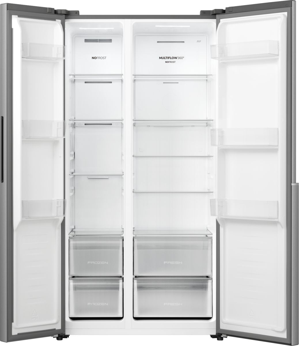 Side-by-side холодильник Gorenje NRS917E41X у виконанні з нержавної сталі поєднує об’єм 544 л нетто з інверторною технологією охолодження. Система NoFrost+ усуває утворення інею, а MultiFlow підтримує рівномірний розподіл повітря. Зовнішній LED-дисплей забезпечує точний контроль температури. Формат із двома дверцятами спрощує доступ до продуктів у щоденному користуванні.