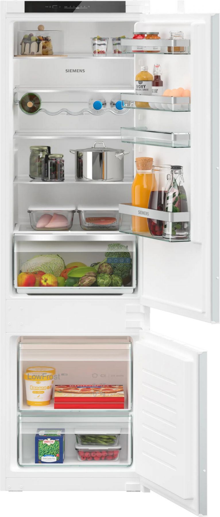 Вбудовуваний холодильник Siemens KI87VVSE0N із нижньою морозильною камерою поєднує раціональне використання простору та стабільну роботу. Холодильне відділення об’ємом 200 л доповнене морозильним на 70 л. Контейнер hyperFresh підтримує свіжість овочів і фруктів упродовж тривалішого часу. LED-освітлення рівномірно висвітлює внутрішній простір. Конструкція з ковзним шарніром забезпечує коректну інтеграцію в кухонні меблі.