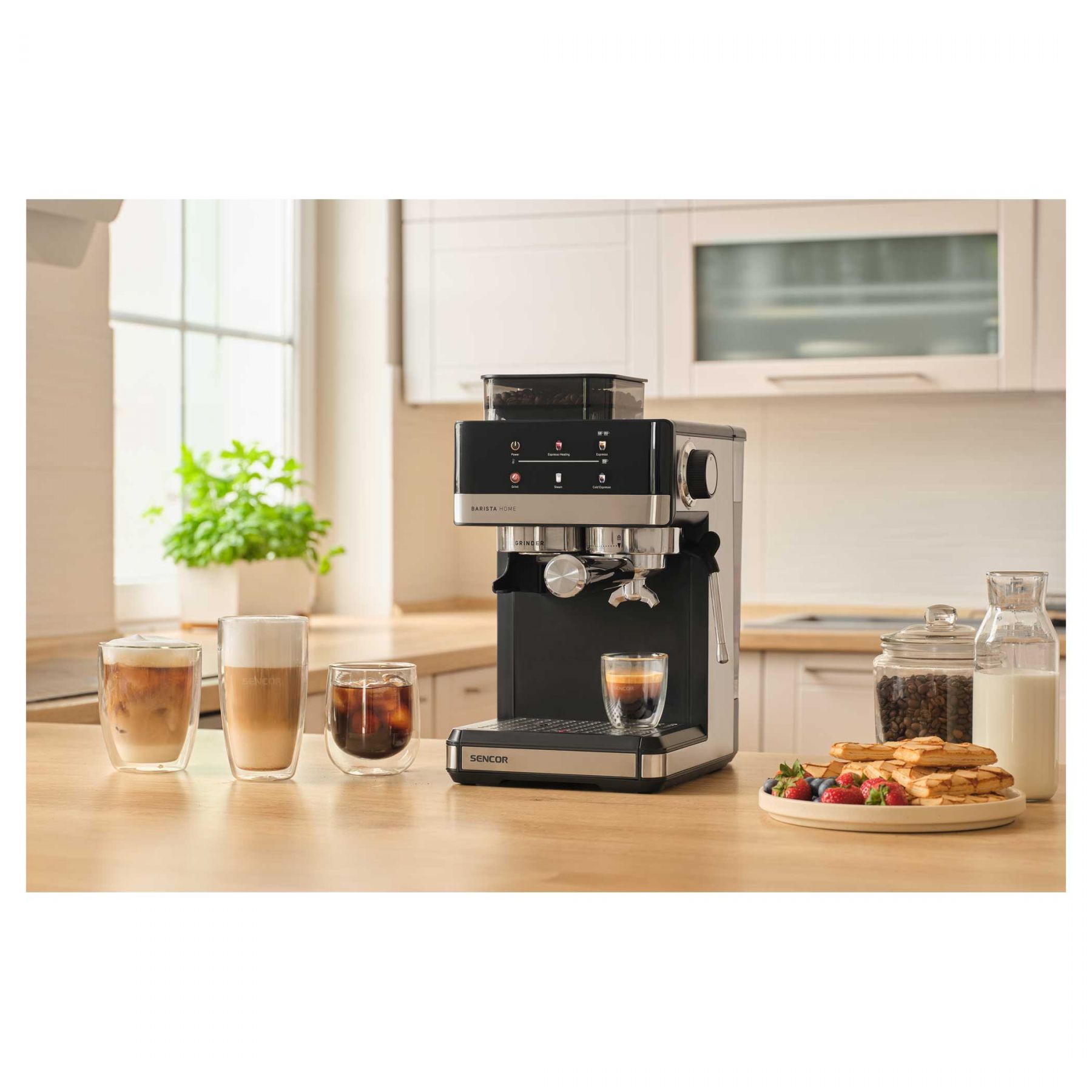 Кавоварка Sencor ріжкова 1.8л, зерно+мелена, вдубована кавомолка, дисплей, нерж. сталь-чорний