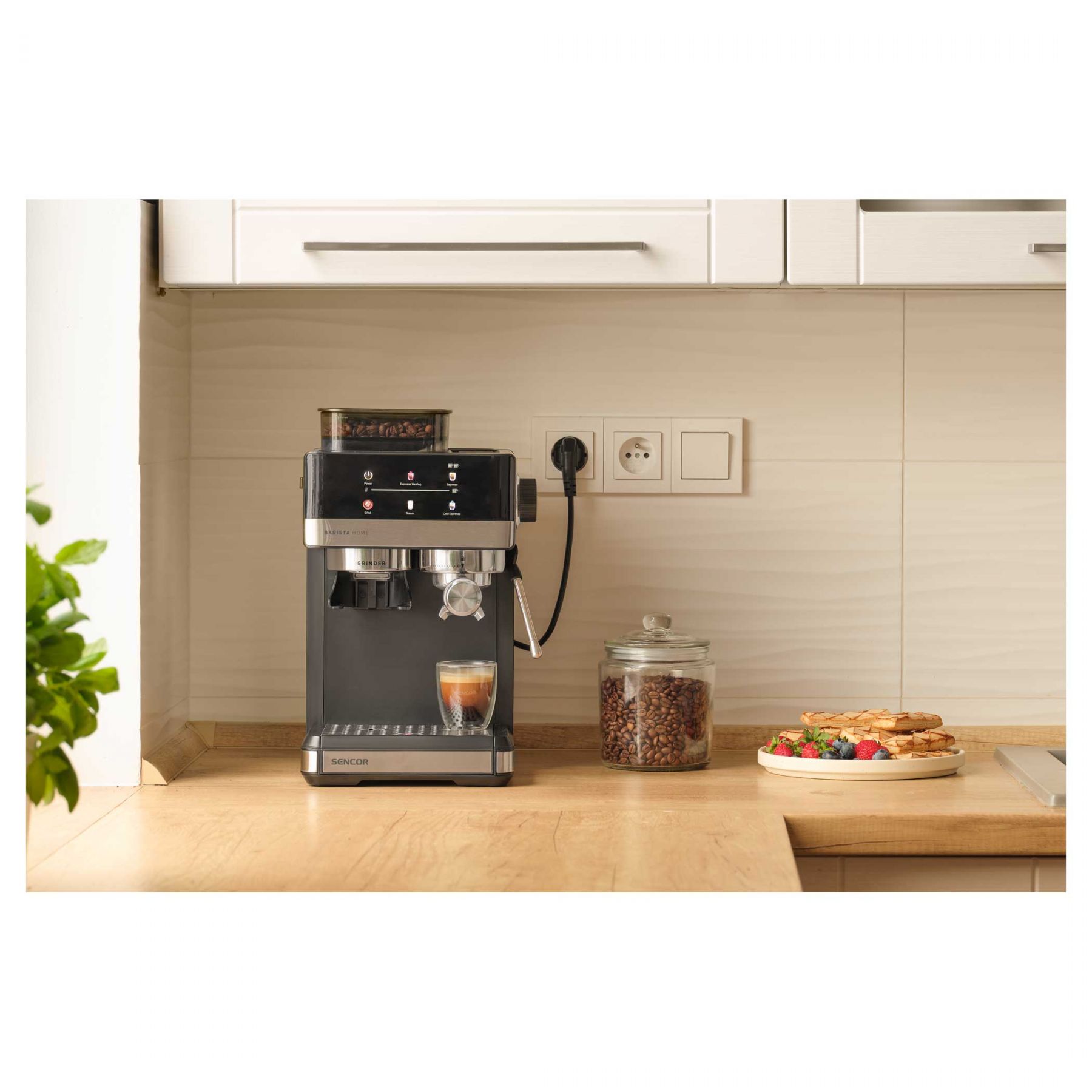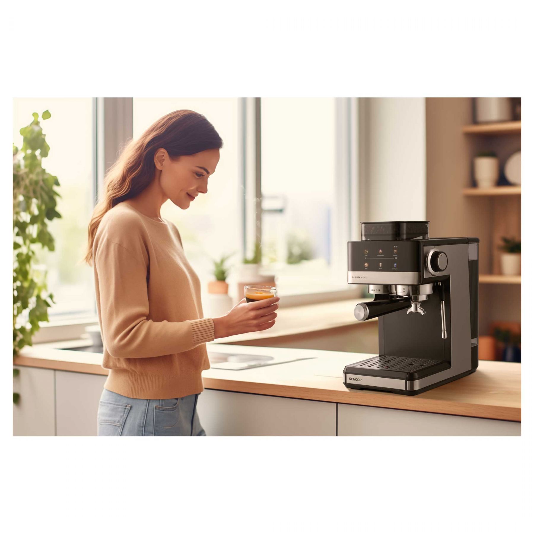 Кавоварка Sencor створена для приготування еспресо з меленої або зернової кави завдяки вбудованій металевій кавомолці. Система Thermoblock забезпечує стабільну температуру, а тиск 20 бар сприяє насиченому смаку напою. Сенсорний дисплей із кольоровими піктограмами полегшує керування режимами. Модель оснащена підігрівачем чашок, обертовою паровою насадкою та автоматичним вимкненням.