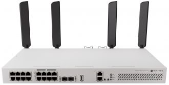 MikroTik CRS418-8P-8G-2S+5axQ2axQ-RM — це потужний комутатор із вбудованим Wi-Fi 6 (4×4 MIMO) та функціями маршрутизатора в одному корпусі 1U. Пристрій має 16 гігабітних Ethernet-портів (8 із PoE-out), 2 порти 10G SFP+, чотириядерний процесор ARM 2.2 ГГц та апаратне прискорення L3. Завдяки USB 3.0 та можливості виносу антен це універсальний центр мережі для офісу чи серверної кімнати.