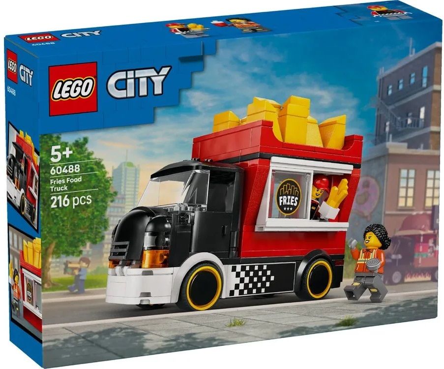 LEGO City Вантажівка з картоплею фрі (60488) — веселий набір для дітей від 5 років, що відтворює яскраву вантажівку фастфуду з знімним кіоском у формі гігантської коробки з картоплею фрі. Діти можуть зняти дах, щоб дістатися до деталізованої зони приготування з фритюрницею, приправами та розсувним вікном для обслуговування. У комплекті мініфігурки продавця та покупця для рольових ігор. Після збірки модель стає чудовим елементом гри в місті. Містить 216 деталей та інструкції в додатку LEGO Builder з 3D-переглядом.