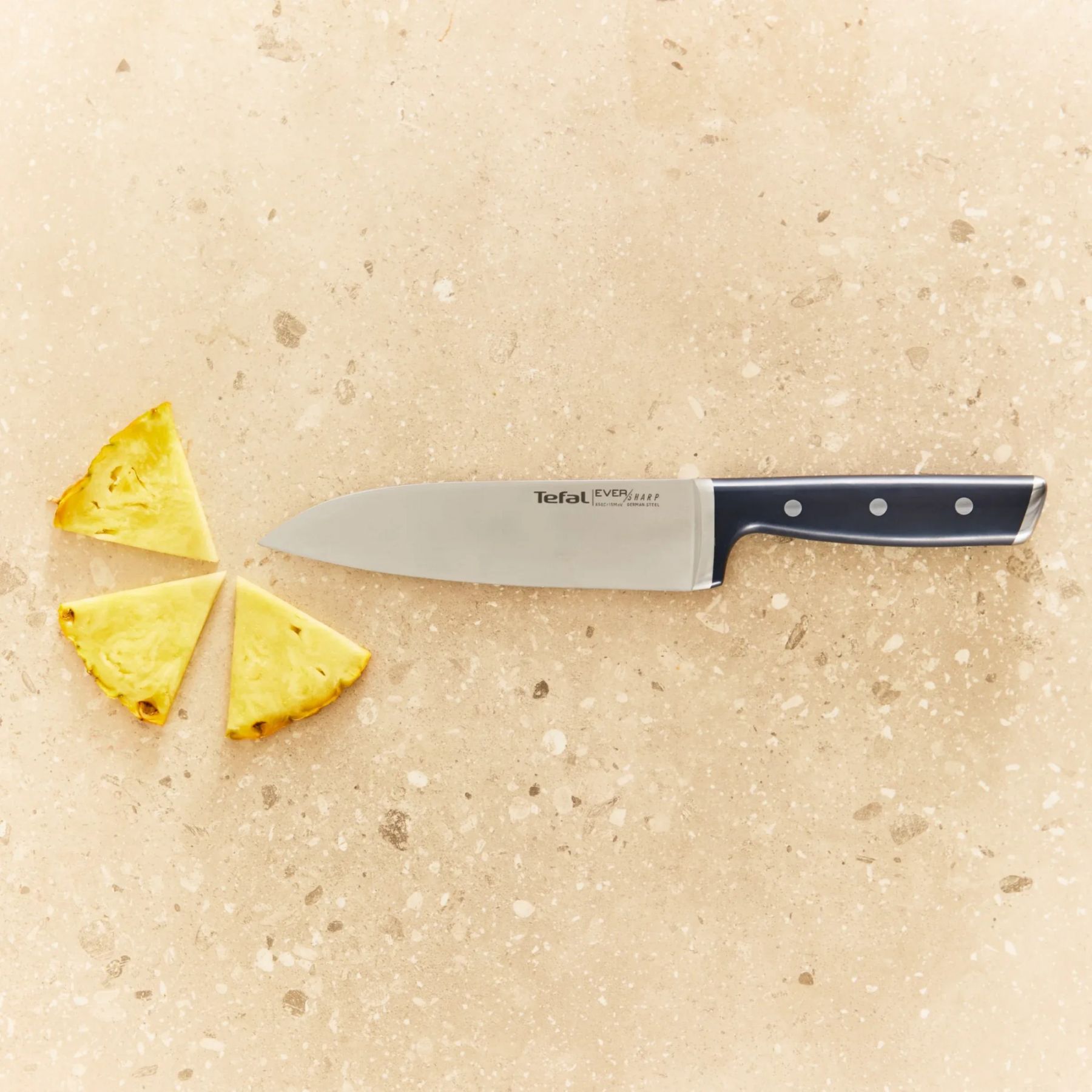 Кухонний ніж шеф-кухаря Tefal EverSharp поєднує лезо з німецької нержавіючої сталі X50Cr15MoV та блок із вбудованою системою автоматичного заточування. Під час діставання та повернення ножа керамічні елементи в блоці підтримують гостроту ріжучої кромки, а ергономічна ручка з упором для пальців забезпечує контроль під час нарізання.