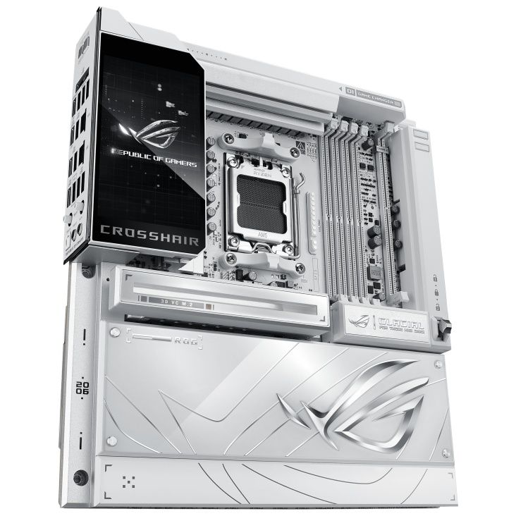 Материнська плата ASUS ROG CROSSHAIR X870E GLACIAL на чіпсеті AMD X870E виконана в білому кольорі та підтримує процесори Ryzen 9000, 8000 та 7000 серій на сокеті AM5. Забезпечує до 256 ГБ DDR5 з розгоном до 9600+ MT/s, до семи слотів M.2 завдяки комплектним картам ROG Hyper M.2 та ROG Q-DIMM.2, два PCIe 5.0 x16 слоти та подвійний 10 Гбіт/с Ethernet. Оснащена Wi-Fi 7, двома USB4 40 Гбіт/с портами, повнокольоровим 5-дюймовим РК-дисплеєм та преміум-аудіо SupremeFX з ESS DAC.