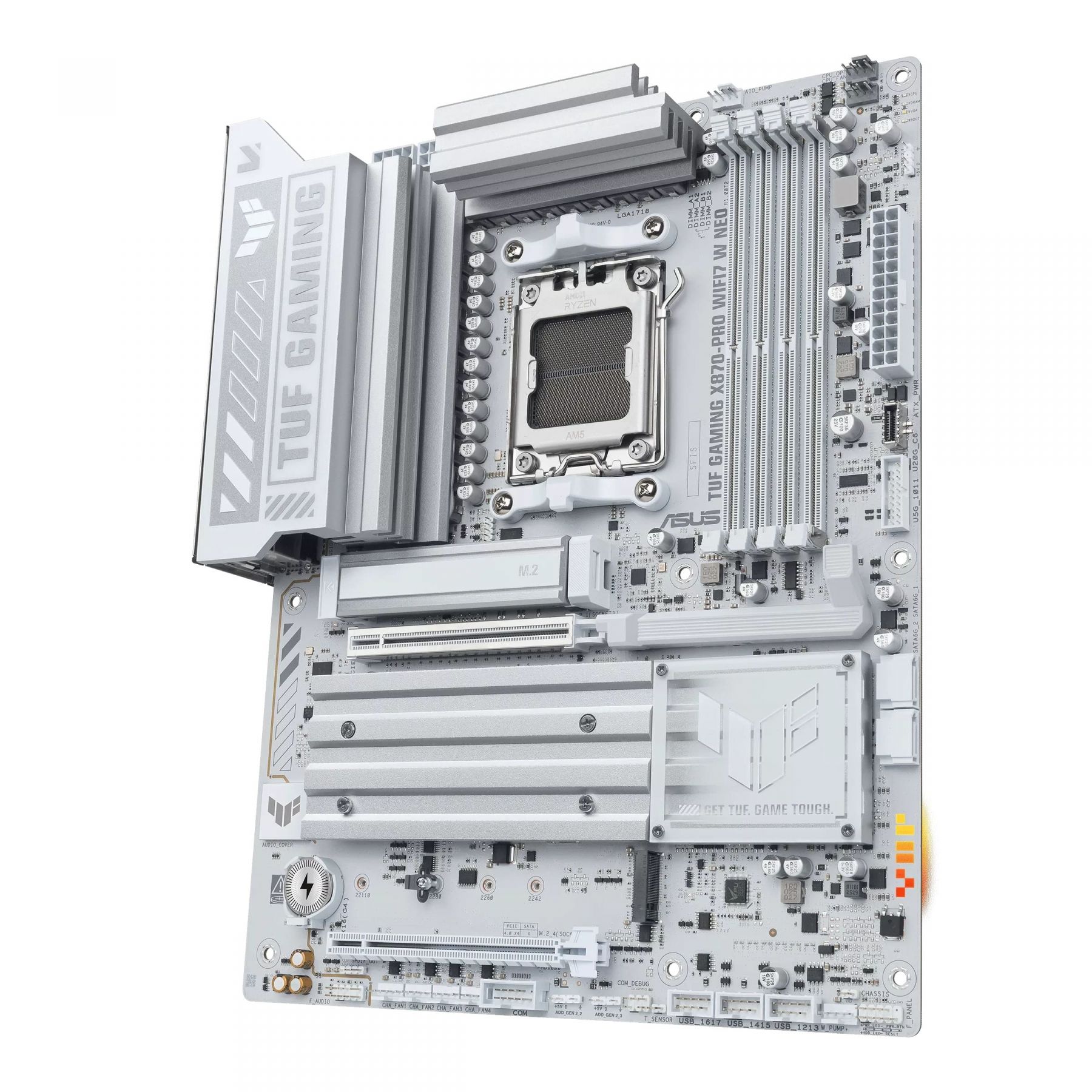 Материнська плата ASUS TUF GAMING X870-PRO WIFI7 W NEO на чіпсеті AMD X870 виконана в білому кольорі та сумісна з процесорами Ryzen 9000, 8000 та 7000 серій на сокеті AM5. Підтримує до 256 ГБ DDR5-пам’яті з розгоном до 9600+ MT/s, чотири слоти M.2 (два з PCIe 5.0) та слот PCIe 5.0 x16 для відеокарт. Оснащена Wi-Fi 7, двома портами USB4 40 Гбіт/с, 5 Гбіт/с Ethernet та аудіо Realtek ALC1220P з DTS обробкою.