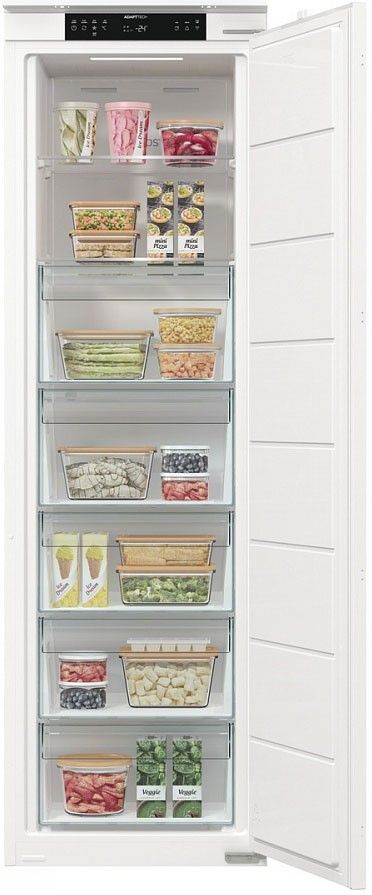 Вбудована морозильна камера Gorenje FNCI517E41WF поєднує місткість 235 літрів із системою NoFrost для стабільного зберігання продуктів без утворення льоду. Інверторний компресор забезпечує рівномірну роботу та контроль температури. Технологія AdaptTech адаптує режим охолодження до циклів відкривання дверцят. Конструкція зі слайдерним кріпленням інтегрується у кухонні меблі. Рівень шуму 35 дБ відповідає умовам житлового простору.