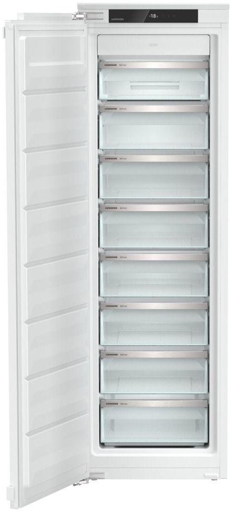 Вбудована морозильна камера об’ємом 209 л із системою NoFrost — жодного інею та потреби в ручному розморожуванні. Працює тихо — лише 33 дБ. Сенсорне внутрішнє керування, функція SuperFrost для швидкого замороження, система VarioSpace для регулювання простору, FrostSafe — герметичні ящики з прозорими фронтами. Сумісна зі SmartDeviceBox для підключення до “розумного дому”. Ідеально підходить для інтеграції в меблі. Розміри: 177×55,9×54,6 см.