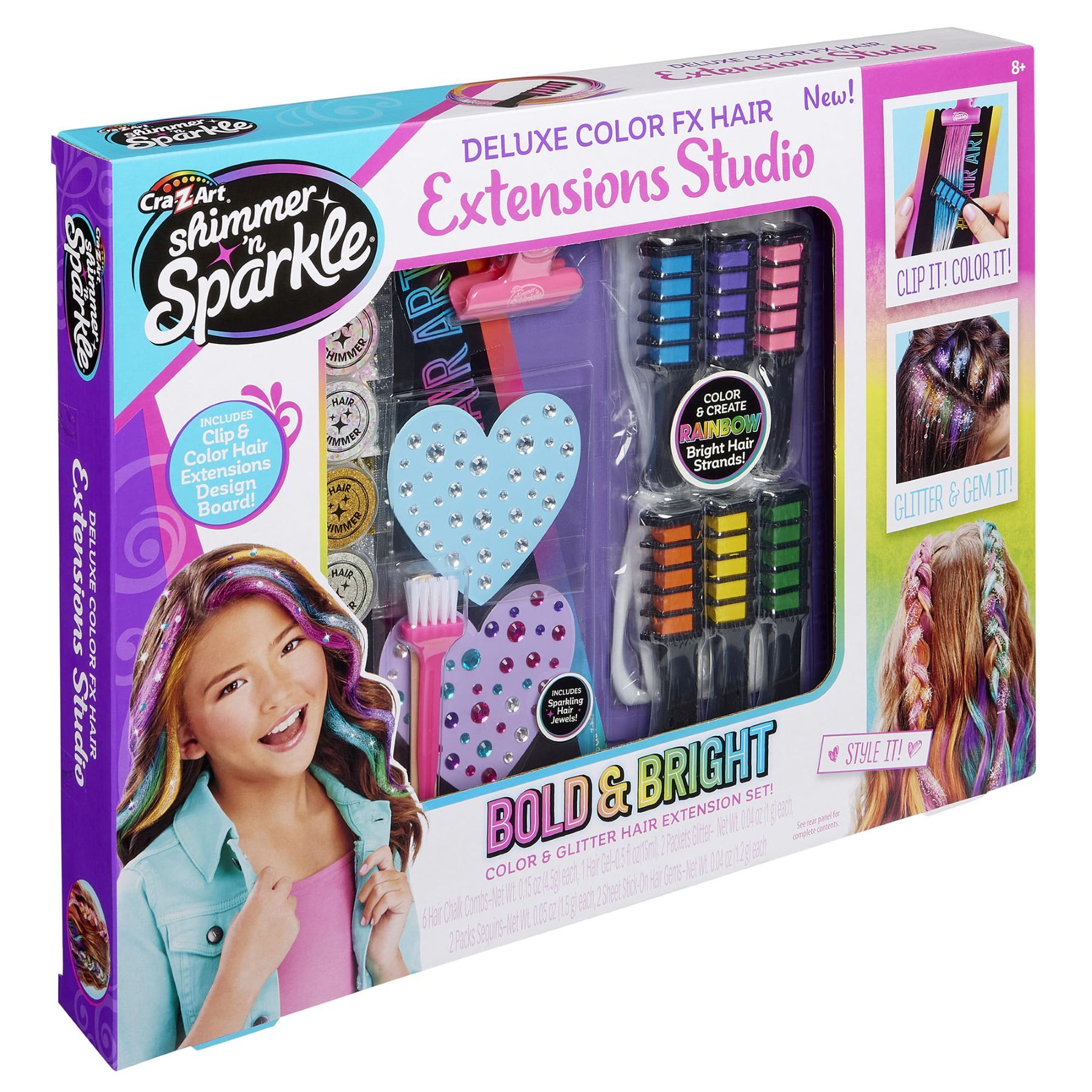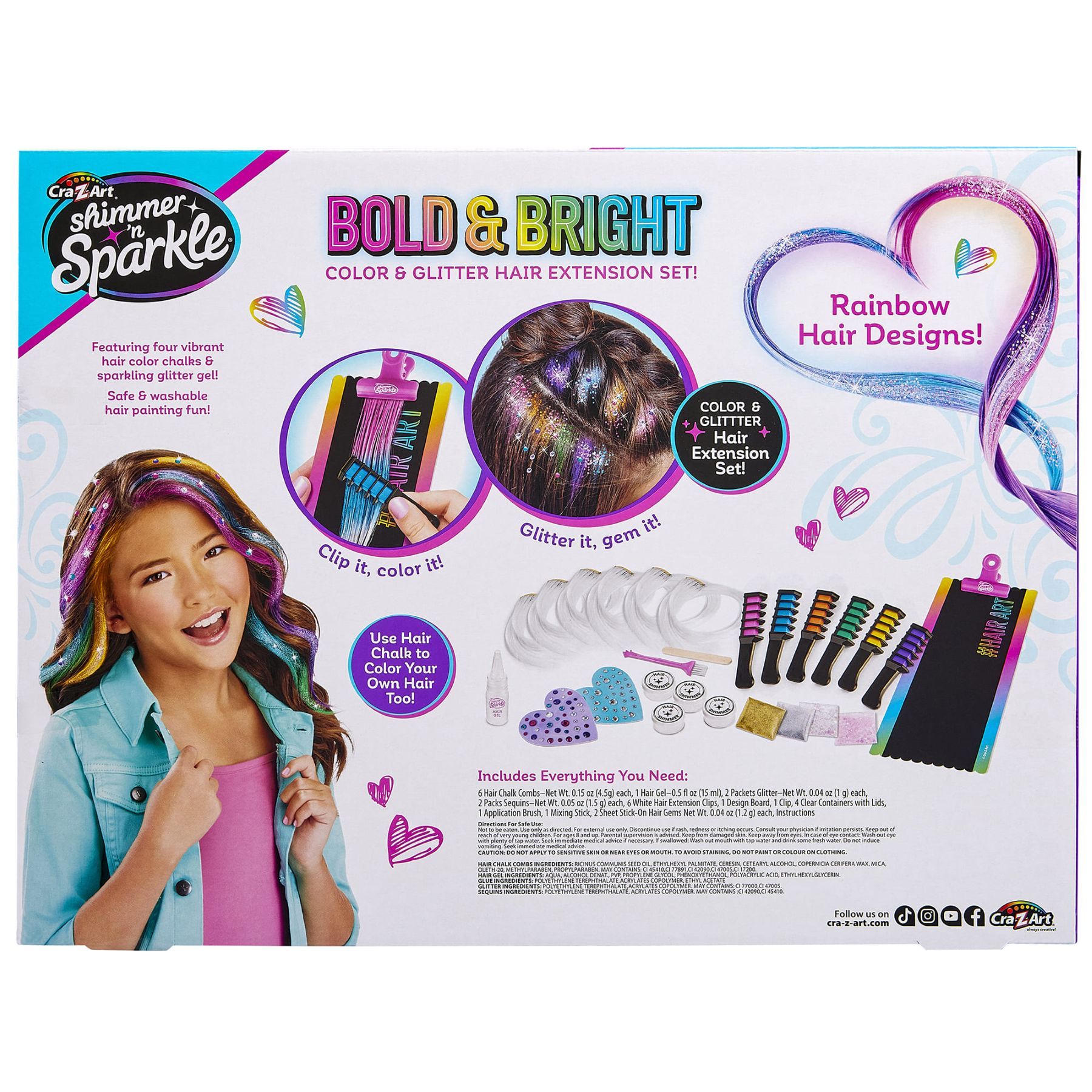 Набір для творчості Cra-Z-Art Color FX призначений для тимчасового декорування волосся та створення зачісок із кольоровими пасмами. У наборі передбачені гребінці з крейдяним пігментом, накладні пасма, декоративні елементи та аксесуари для оформлення зачісок. Формат набору дозволяє експериментувати з кольором і декоративними деталями під час створення різних образів.