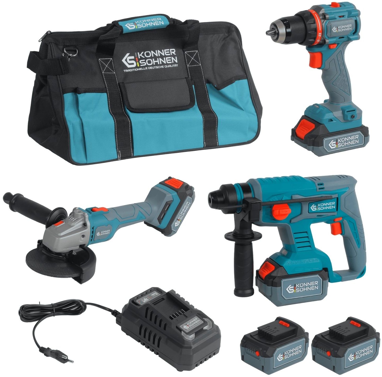 Набір із трьох акумуляторних інструментів Konner&Sohnen KS RHAGD 20V SET 3 20В дриль, шліфмашина кутова, перфоратор, швидкий ЗП 4.5А акб 2х4А·год сумка 7.5кг