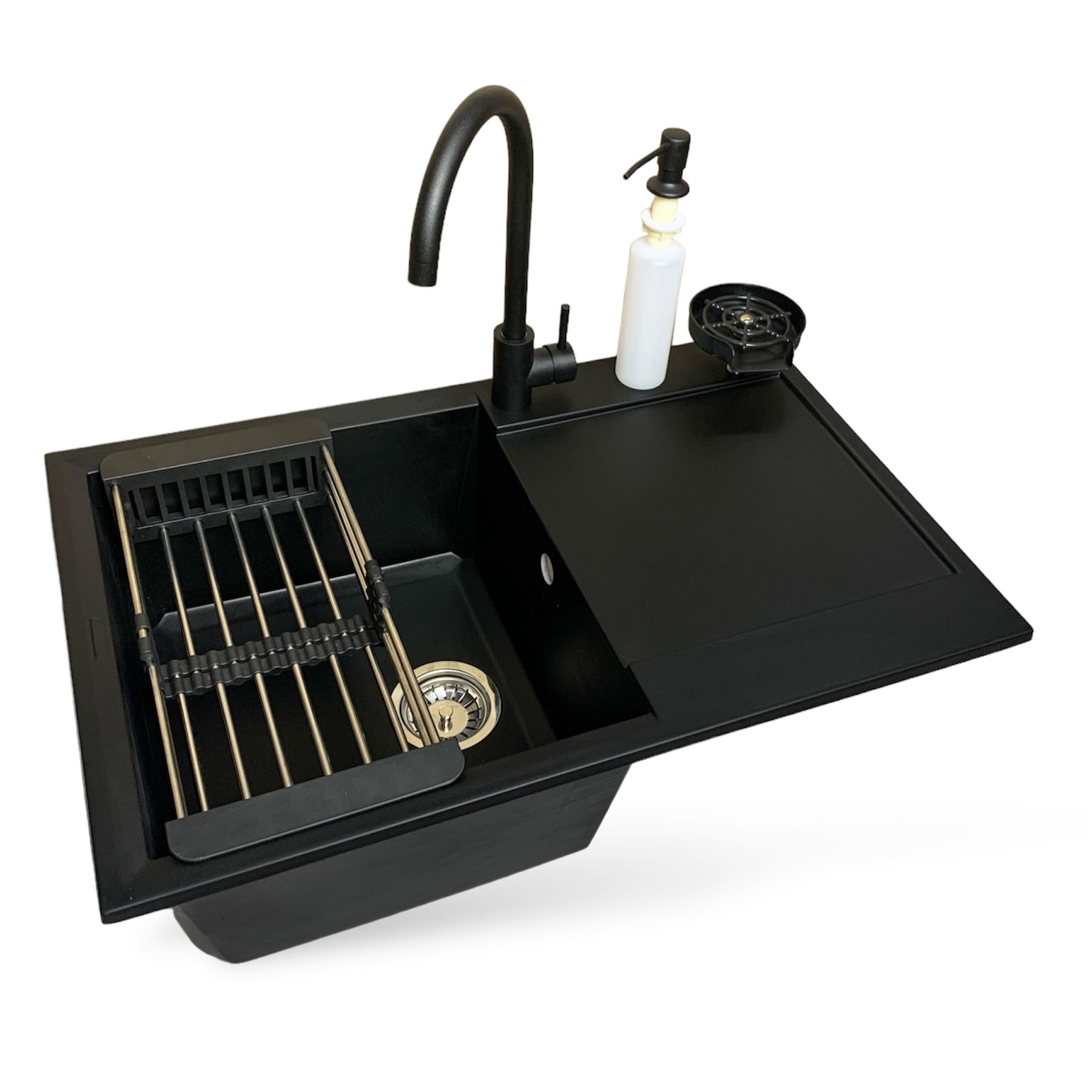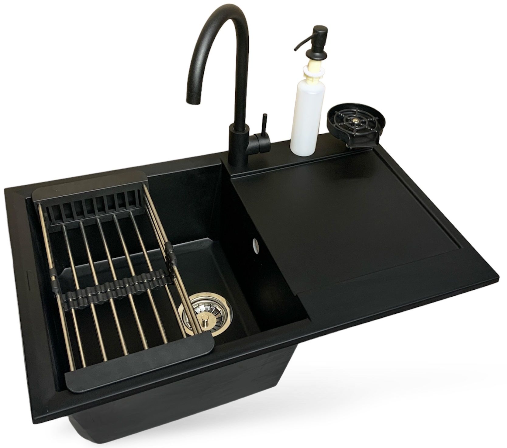 Набір кухонний Adamant Horizon, штучний камінь, прямокут., з крилом, 780х495х230мм, чаша - 1, врізна, антрацит + змішувач + дозатор + ополіскувач склянок + коландер
