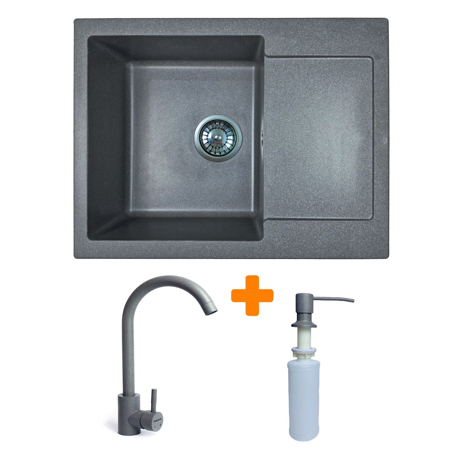Набір кухонний Adamant Minimal, штучний камінь, прямокут., з крилом, 615х495х200мм, чаша - 1, врізна, сірий + змішувач та дозатор