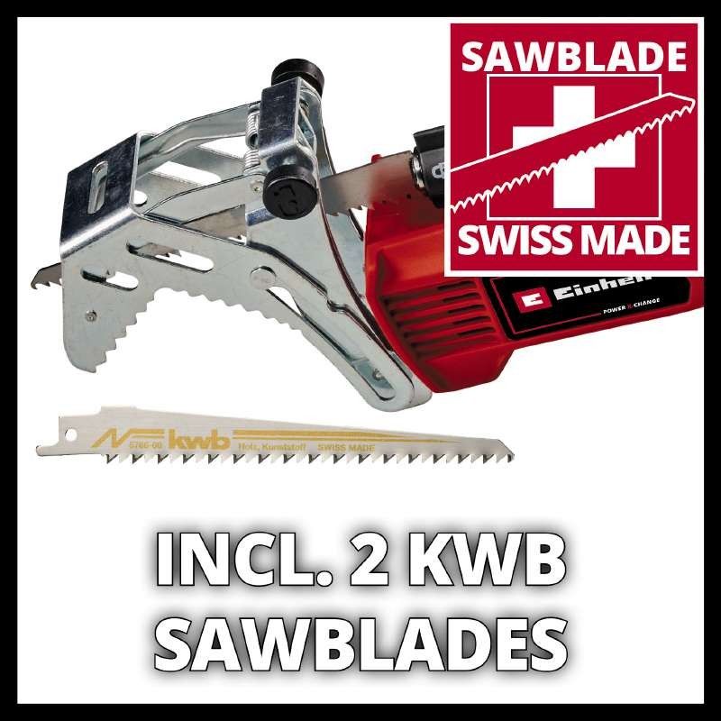 Комплектація:пила Einhell GE-GS 18/150 Li — 1 шт., акумулятор 18В 2,5 А·год — 1 шт., зарядний пристрій — 1 шт., пильне полотно KWB (Швейцарія) — 2 шт.