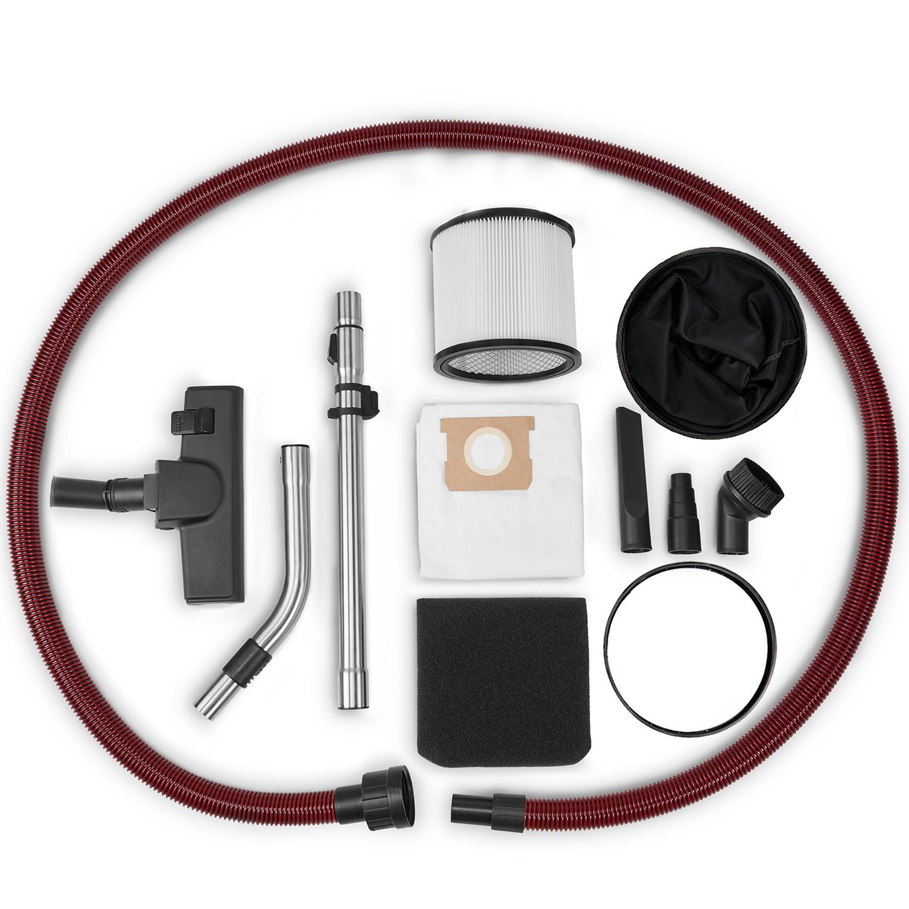 Додатково:Вбудована розетка, Функція видування, Пластиковий всмоктувальний шланг 3 м, Бак з нержавіючої сталі, Зливна пробка для води, Колеса, ролики, ручка візка для транспортування