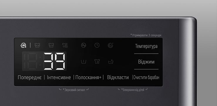 Програми:Бавовна, Спортивний одяг, Полоскання + Віджим, TurboWash 39, Еко 40-60, Змішані тканини, Делікатне прання, пухова ковдра, Гіпоалергенне прання, Повсякденне прання, Прання з ШІ (AI Wash), Швидке 14
