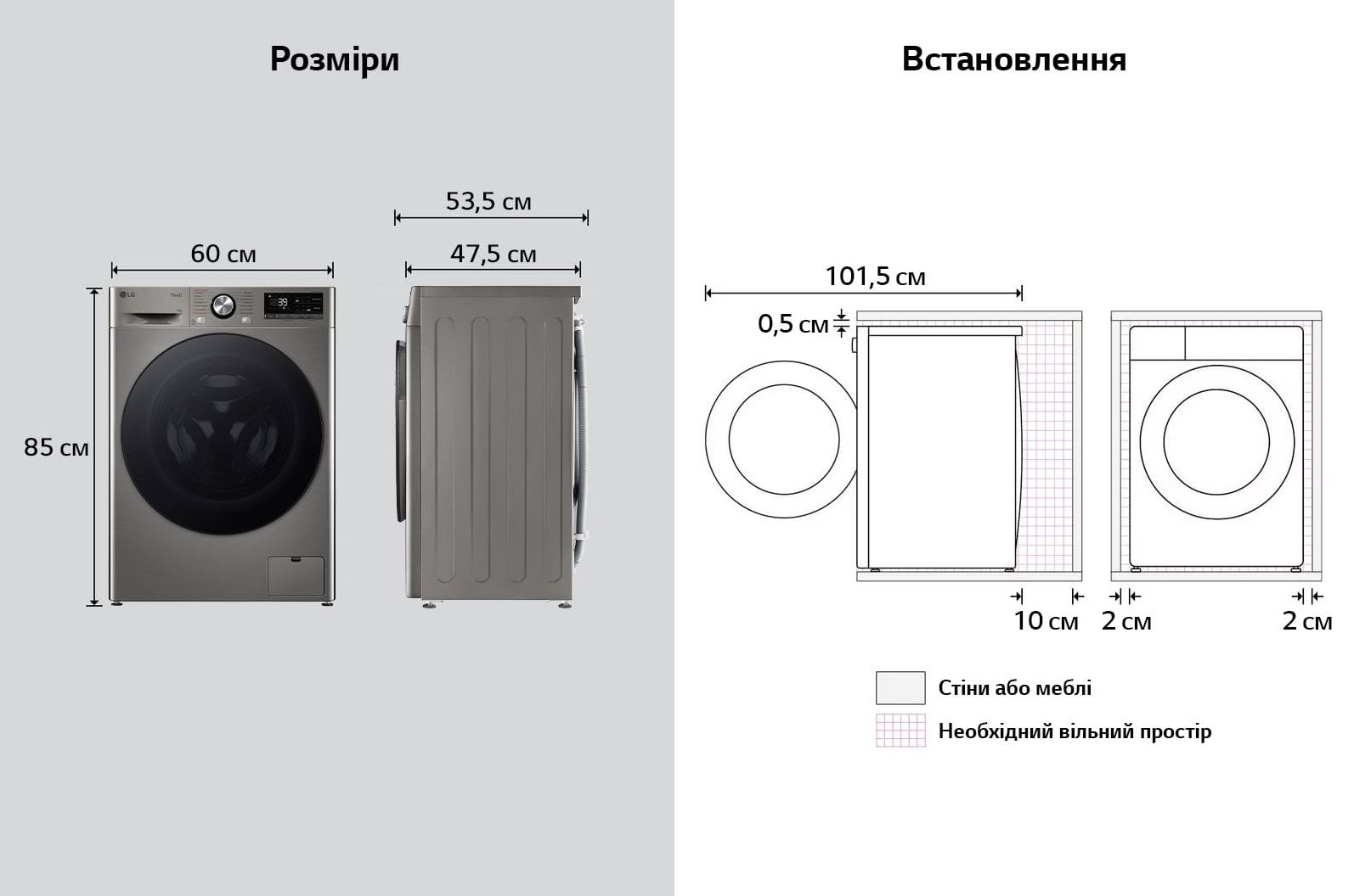 Особливості:Smart Diagnosis, TurboWash, Технологія визначення властивостей тканини AI DD ™, Технологія ''6 рухів турботи'' 6 Motion, Індикація залишкового часу програми, Інтелектуальні функції LG ThinQ™ (Wi-Fi), індикатор етапу циклу прання, індикація обраних параметрів програми прання, індикація незачинених дверцят, індикація помилок у роботі, затримка завершення циклу прання (3-19 годин), автоматичний перезапуск зі збереженням попередніх налаштувань, блокування панелі керування від дітей, Функція обробки парою Steam, 'Система зменшення рівня вібрації, Індикація завершення роботи, відкриття дверей: праворуч, Збільшений розмір перемикача програм, індикація режиму "Відкласти завершення", індикація режиму "Блокування від дітей", індикація режму "Віддалений старт", Завантаження додаткових програм через додаток LG ThinQ™ по Wi-Fi