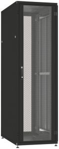Комплектація:збірна несуча конструкція, шина і дроти заземлення, регульовані ніжки, двері передні і задні металеві, перфоровані (просвіт 80%) з триточковим замком і ручкою, дві бічні, суцільні стінки з одноточковим замком, дві пари монтажних профілів на відстані 19"