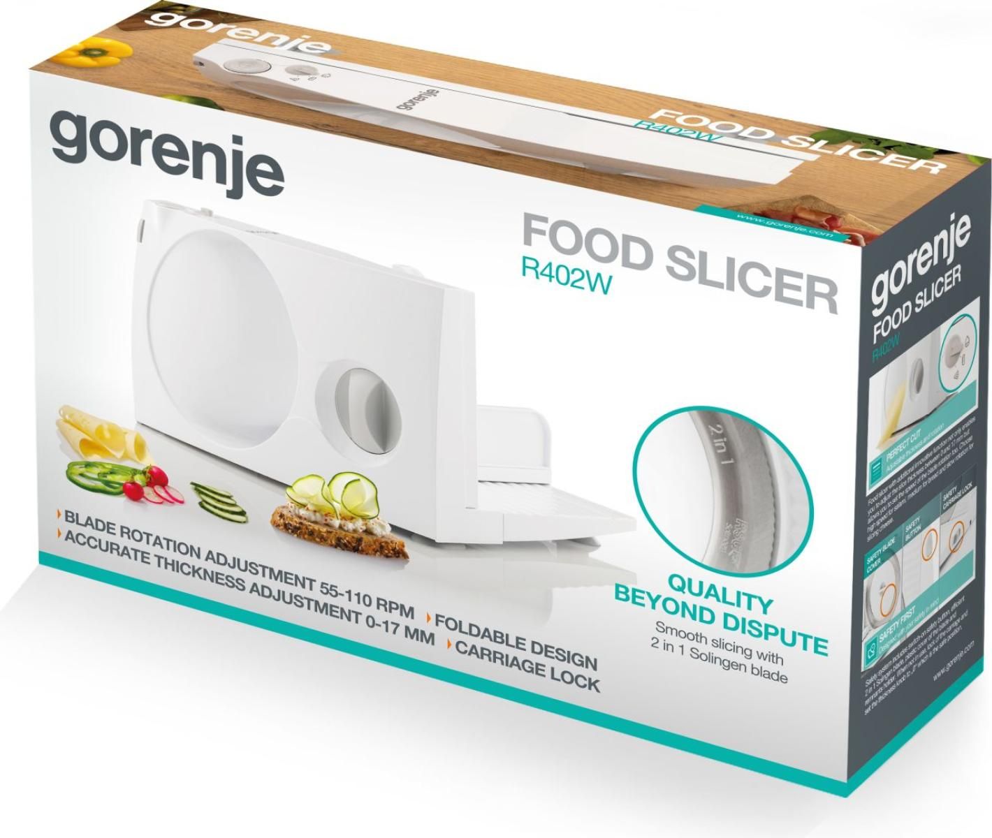 Скиборізка Gorenje призначена для рівного нарізання м’яса, сиру, хліба, овочів і фруктів у домашніх умовах. Лезо Solingen діаметром 17 см працює з регулюванням швидкості та дозволяє підлаштовувати різання під різні продукти. Товщина скибочки налаштовується в межах до 17 мм. Конструкція складається для зберігання, а знімні частини спрощують догляд.