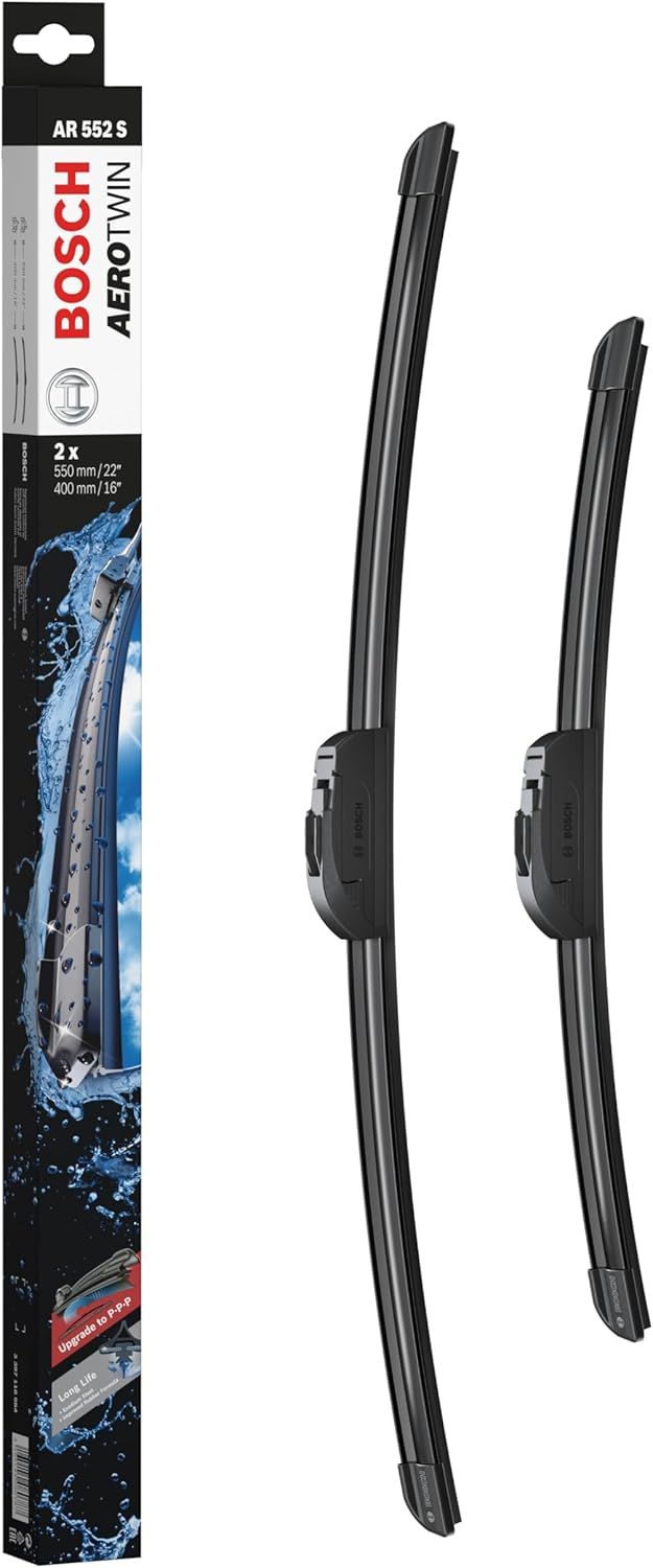 Склоочисник BOSCH Aerotwin безкаркасний комплект складається з двох елементів довжиною 550 мм і 400 мм. Безкаркасна конструкція забезпечує рівномірний притиск леза по всій поверхні лобового скла. Виріб належить до серії AEROTWIN RETROFIT і призначений для автомобілів з лівостороннім розташуванням керма. Комплект підходить для заміни склоочисників на передньому склі.