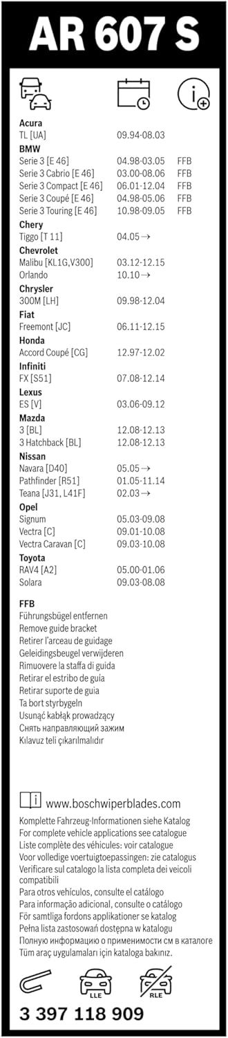 Комплект безкаркасних склоочисників Bosch Aerotwin 3397118909 складається з двох щіток довжиною 600 мм і 475 мм. Вони призначені для автомобілів з лівостороннім керуванням і забезпечують щільне, рівномірне прилягання до лобового скла. Аеродинамічний спойлер і спеціальна гумова суміш Power Protection Plus зменшують шум під час роботи та продовжують термін служби щіток. Комплект підходить для багатьох сучасних моделей, де потрібна якісна очистка скла в різних погодних умовах.