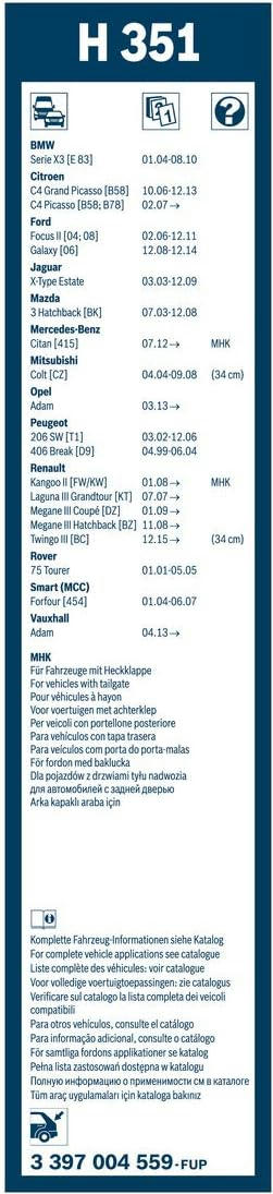 Склоочисник BOSCH Rear каркасний має довжину 350 мм і призначений для заднього скла автомобіля. Каркасна конструкція забезпечує надійний притиск леза до скла. Виріб належить до серії TWIN. Така будова добре підходить для стандартних умов експлуатації.