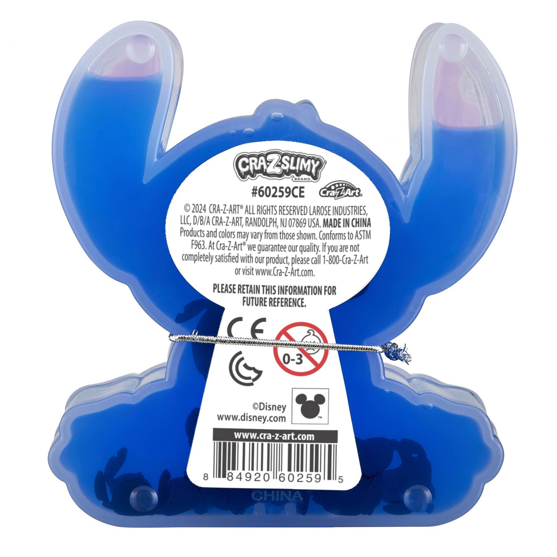 Слайм Cra-Z-Art Stitch використовується для сенсорної гри та експериментів із текстурами. Слайм розміщений у контейнері у формі персонажа Disney Stitch та містить декоративні елементи для створення візуальних ефектів. Формат набору дозволяє змішувати декоративні добавки зі слаймом під час гри. Контейнер використовується для зберігання слайму після використання.