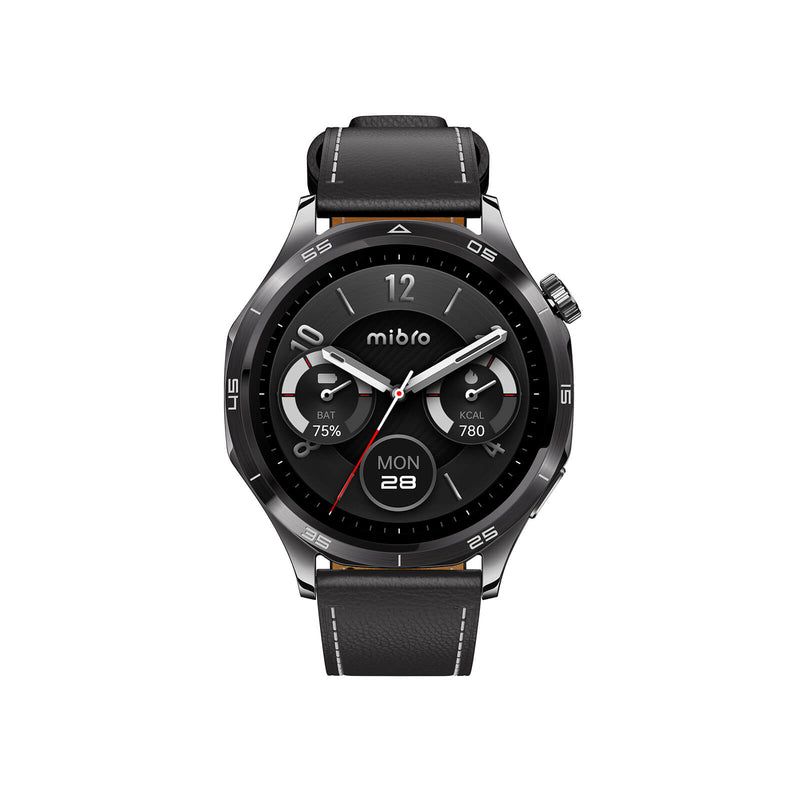 Смарт-годинник Mibro GT у темному металевому корпусі діаметром 46 мм обладнаний AMOLED-екраном 1.43 дюйма з роздільною здатністю 466x466 пікселів і яскравістю до 600 ніт. Датчики відстежують пульс, рівень кисню в крові та стрес цілодобово, а захист 5 ATM дозволяє використовувати пристрій у воді. Навігація GNSS та понад 100 режимів для спорту доповнюються AI-функціями, як голосовий асистент і генерація циферблатів.