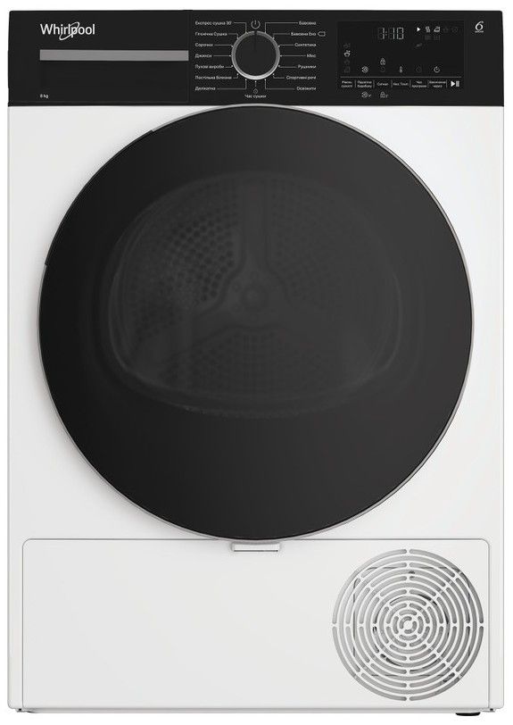 Сушильна машина Whirlpool тепловий насос, 8кг, A++, 54,5см, дисплей, люк чорний, білий