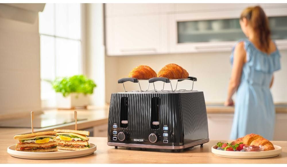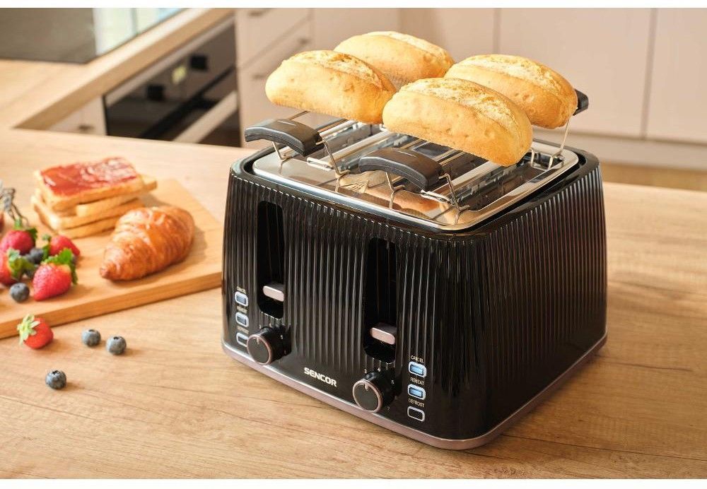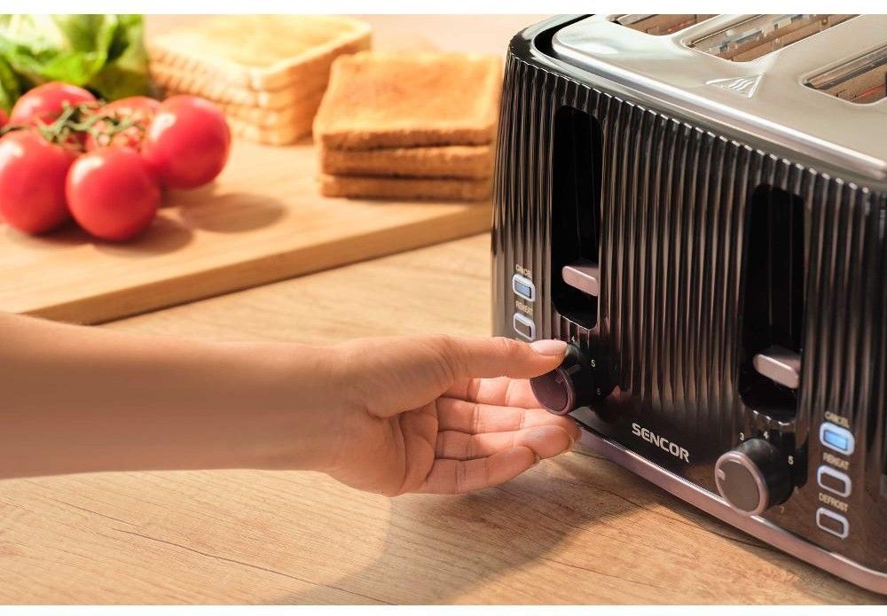Sencor STS7541BK — потужний 4-слотовий тостер (1860 Вт) з 7 рівнями підсмажування, функціями розморожування, підігріву та миттєвої зупинки. Знімна решітка для булочок, великий піддон для крихт і стильний чорний корпус. Ідеальний для великої сім’ї або офісу — одночасно готує 4 тости.