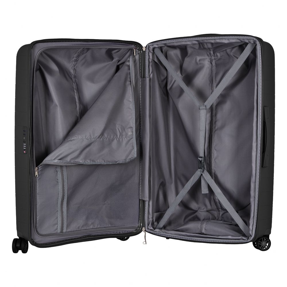 Особливості:можливість розширення (збільшення об'єму), телескопічна висувна ручка, подвійні колеса, передбачено розділювачі та регульовані пакувальні паски всередині