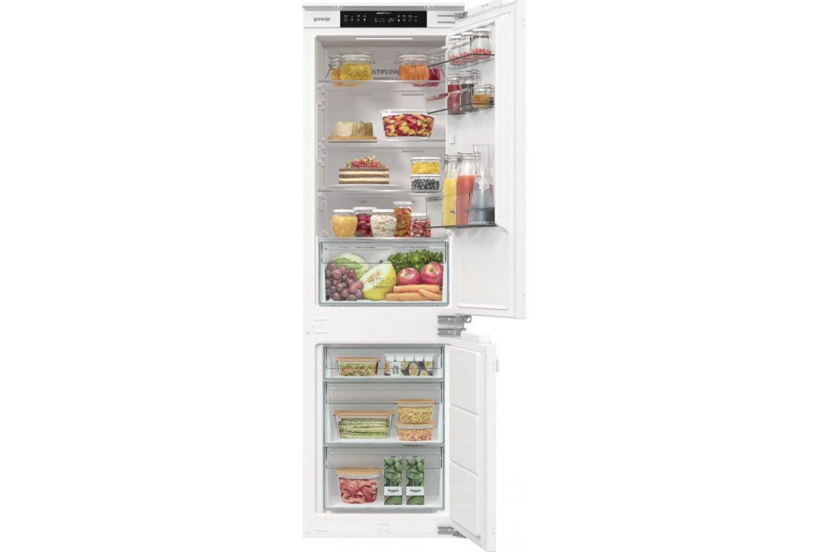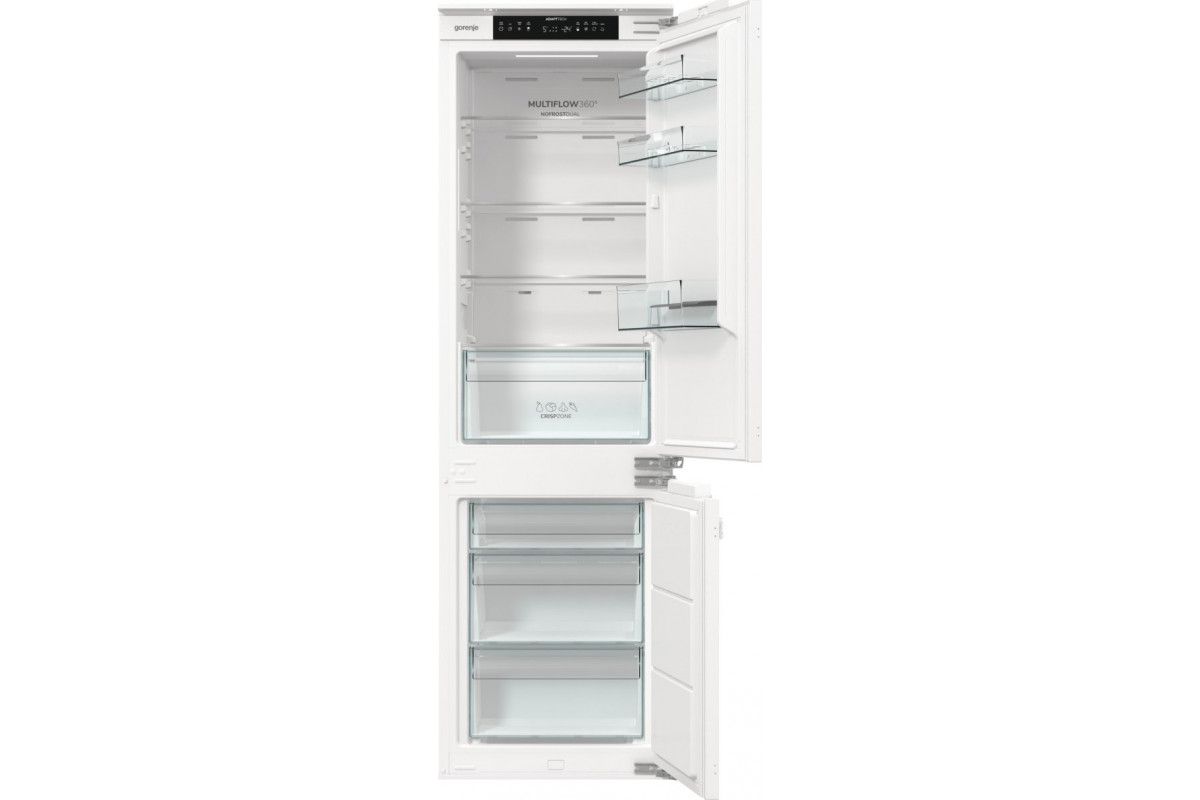 Вбудований холодильник Gorenje NRKI517E42 розрахований на інтеграцію в кухонні меблі висотою 177 см. Загальний об’єм 252 л включає 176 л холодильної та 76 л морозильної камери. Система NoFrost Plus у поєднанні з Multi Air Flow забезпечує рівномірне охолодження без утворення інею. Жорстке кріплення фасадів із шарніром SoftClose підтримує точне та плавне закривання дверцят.
