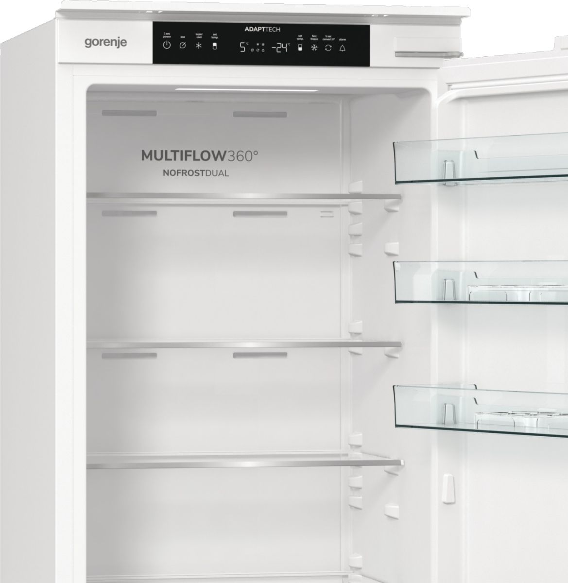 Вбудований холодильник Gorenje NRKI519E41 поєднує продуману організацію простору та стабільне охолодження. Загальний об’єм 284 л включає 208 л холодильної та 76 л морозильної камери. Система NoFrost Plus і циркуляція Multi Air Flow підтримують рівномірну температуру без утворення інею. Електронне керування з окремим LED-дисплеєм забезпечує точний контроль параметрів.