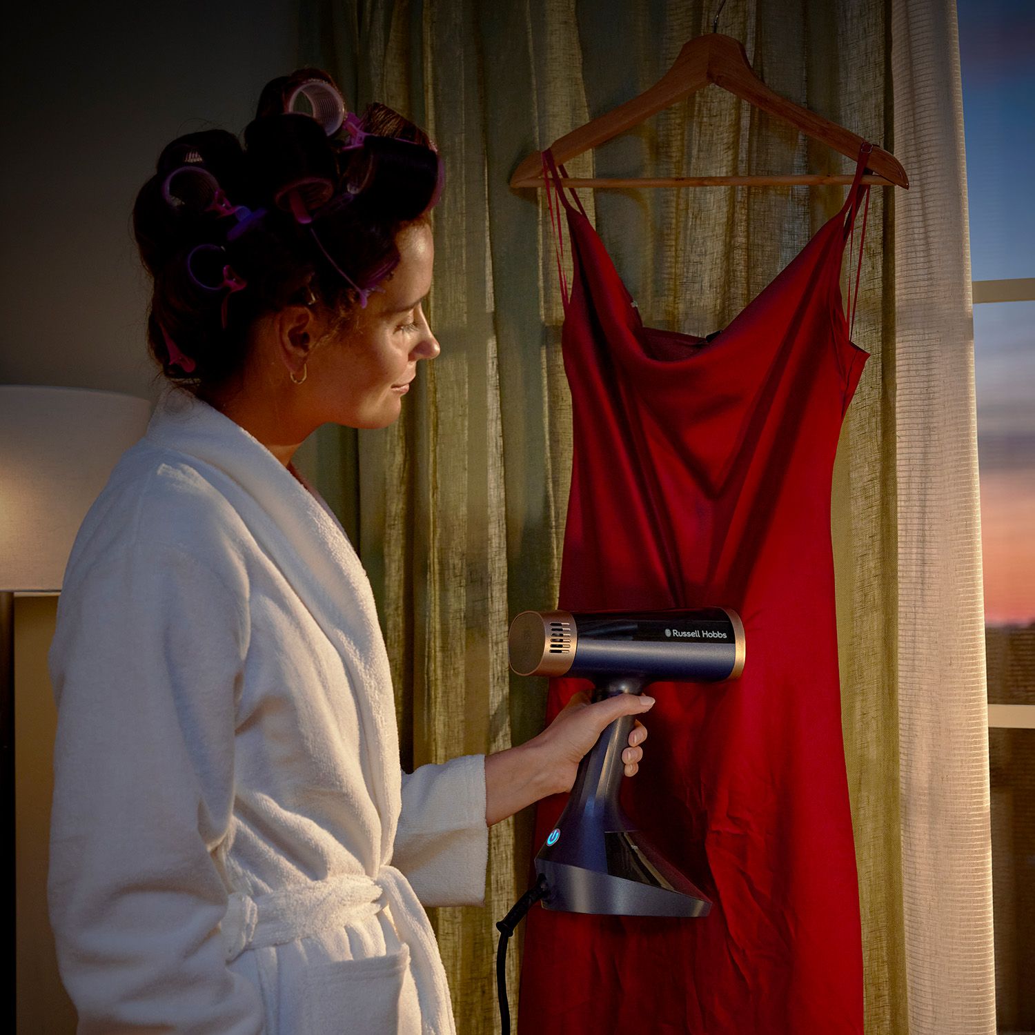 Ручний відпарювач Russell Hobbs Steam Genie VacuSteam з потужністю 1500 Вт поєднує подачу пари та вакуумне притискання тканини завдяки технології VacuSteam. Нагрівання триває близько 35 секунд, подача пари до 24 г/хв підтримується приблизно 7 хвилин від одного заповнення знімного резервуара на 200 мл. Керамічна нагрівальна платформа допомагає розправляти складки за один прохід. Передбачено 3 режими пари та всмоктування, автоматичне вимкнення, щітку для чищення та мережевий кабель довжиною 3 м.