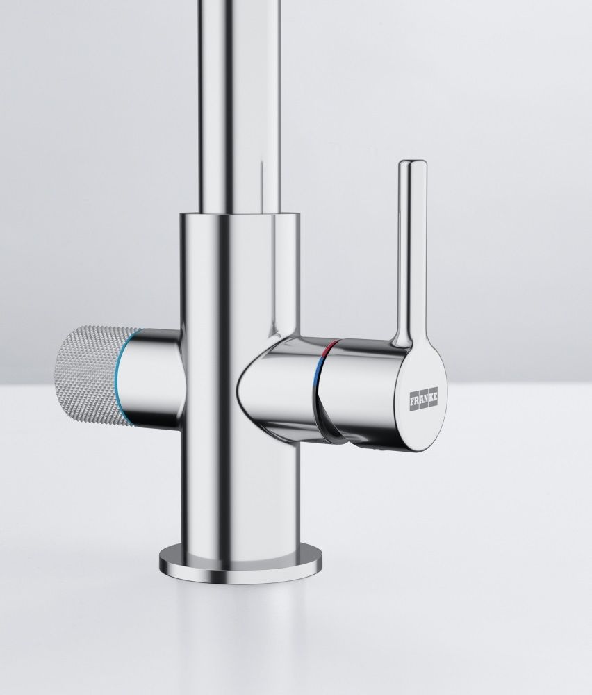 Змішувач Franke Lina J Clear Water 2.0 поєднує класичний J-подібний вилив і можливість подачі фільтрованої води. Поворотний вилив на 360° забезпечує зручну роботу з мийкою будь-якого формату, включно з острівними кухнями. Окремий канал для очищеної води дозволяє використовувати фільтраційні системи, зокрема зворотний осмос. Бічний важіль керування відкривається вперед, що спрощує монтаж біля стіни. Хромоване покриття надає змішувачу стриманого сучасного вигляду.